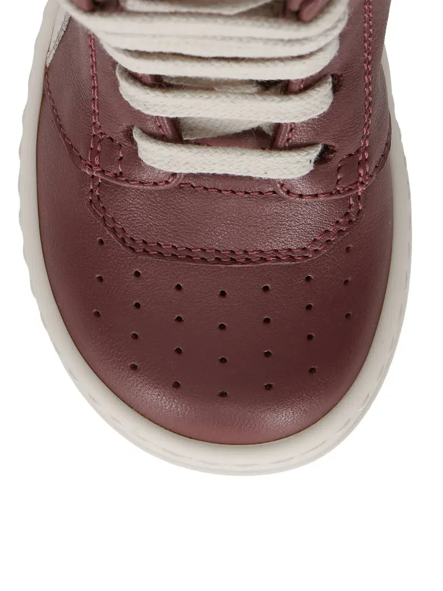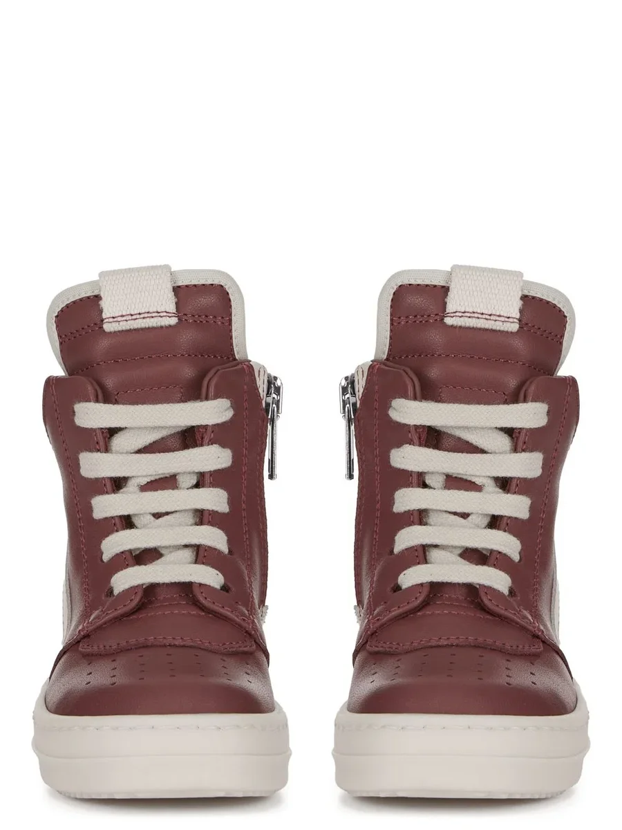 THESE BABYGEOS ADAPT THE SIGNATURE RICK OWENS GEOBASKET SHAPE FOR INFANTS AND ARE CRAFTED FOR FIRST STEPS. THEY HAVE LACES, A SIDE ZIPPER FOR EASY FASTENING AND GEOMETRIC SEAMS WITH VISIBLE STITCHING AND SHARK-TOOTH SOLES.
