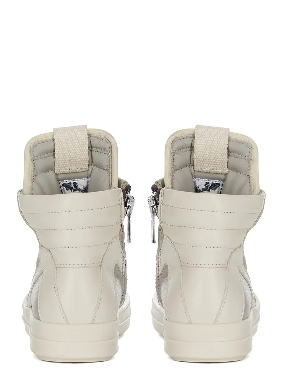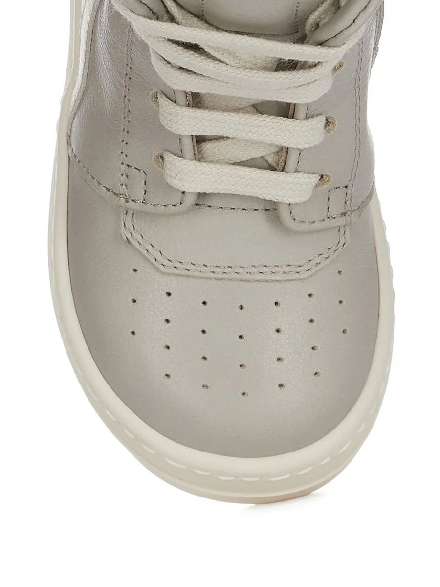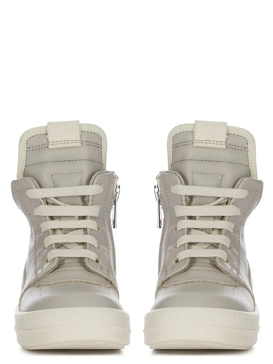 THESE BABYGEOS ADAPT THE SIGNATURE RICK OWENS GEOBASKET SHAPE FOR INFANTS AND ARE CRAFTED FOR FIRST STEPS. THEY HAVE LACES, A SIDE ZIPPER FOR EASY FASTENING AND GEOMETRIC SEAMS WITH VISIBLE STITCHING AND SHARK-TOOTH SOLES.