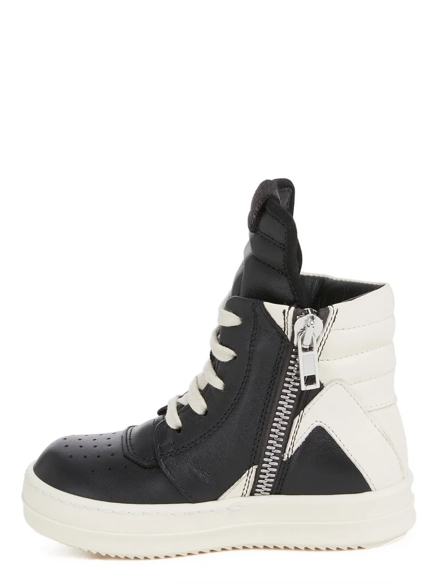 THESE BABYGEOS ADAPT THE SIGNATURE RICK OWENS GEOBASKET SHAPE FOR INFANTS AND ARE CRAFTED FOR FIRST STEPS. THEY HAVE LACES, A SIDE ZIPPER FOR EASY FASTENING AND GEOMETRIC SEAMS WITH VISIBLE STITCHING AND SHARK-TOOTH SOLES.