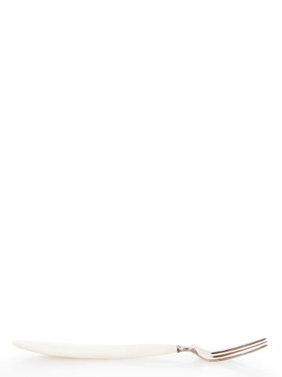 RICK OWENS DESSERT FORK FEATURES A THREE TINE STERLING SILVER TOP AND ANATURAL COLOR BONE HANDLE.