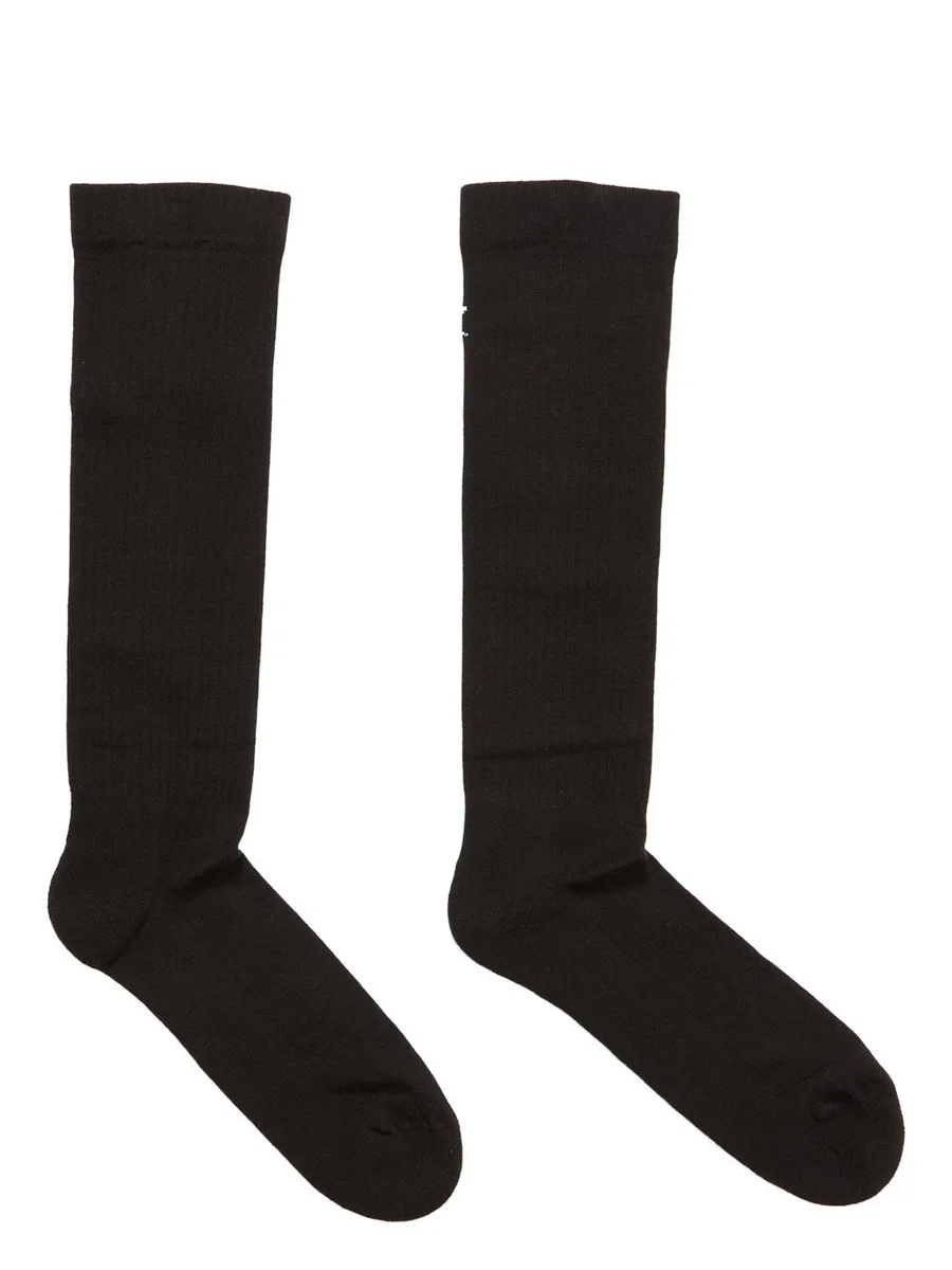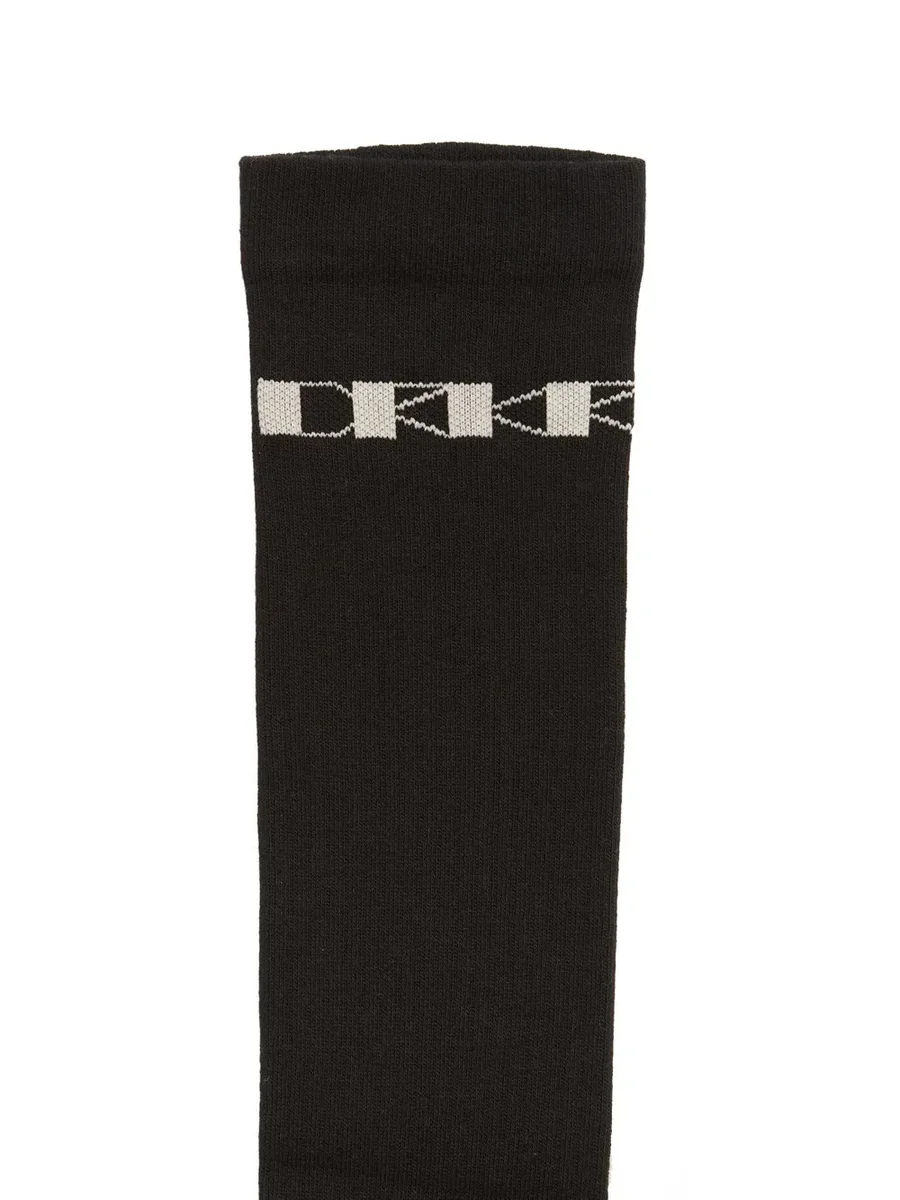 THESE PENTAGRAM KNEE HIGH SOCKS FINISH JUST BELOW KNEE LENGTH. THEY FEATURE THE WORD DRKSHDW ON THE FOOT OF THE RIGHT SOCK AND THE PENTAGRAM LOGO ON THE UPPER LEFT LEG, IN KNIT JACQUARD.