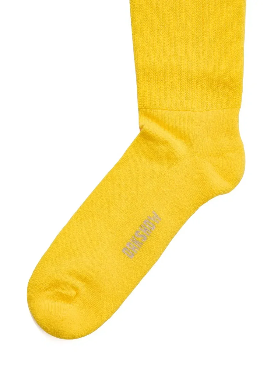 THESE CUNTY KNEE HIGH SOCKS FINISH JUST BELOW KNEE LENGTH. THEY FEATURE THE WORD DRKSHDW ON THE FOOT OF THE RIGHT SOCK AND THE CUNTY LOGO ON THE FOOT OF THE LEFT SOCK, IN KNIT JACQUARD.
