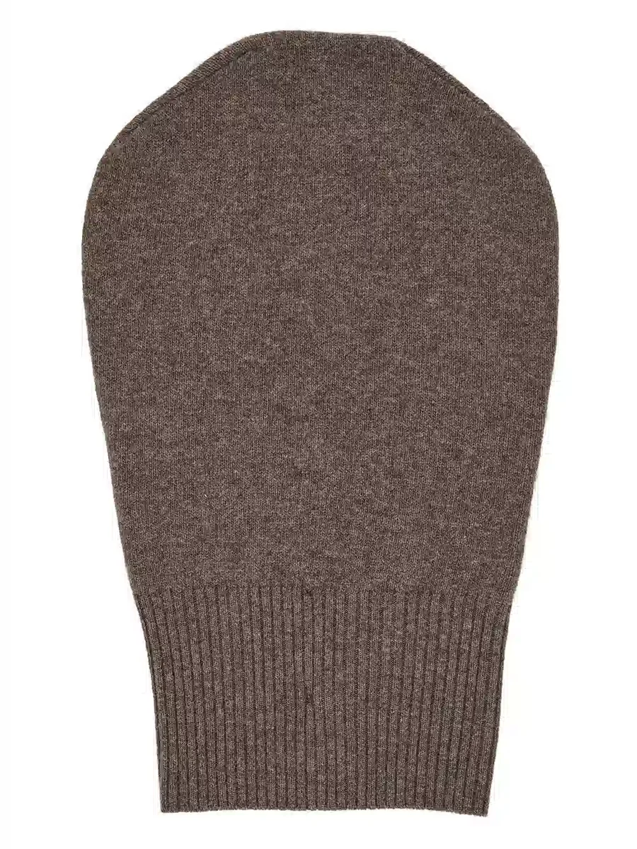 THIS KNIT SKULL IS A BALACLAVA THAT COVERS THE HEAD AND NECK WITH A WIDE ROUNDED OPENING FOR THE FACE AND A WIDE RIBBED NECK. IT HAS AN EMBROIDERED RICK OWENS +MONCLER PATCH ON THE FOREHEAD.