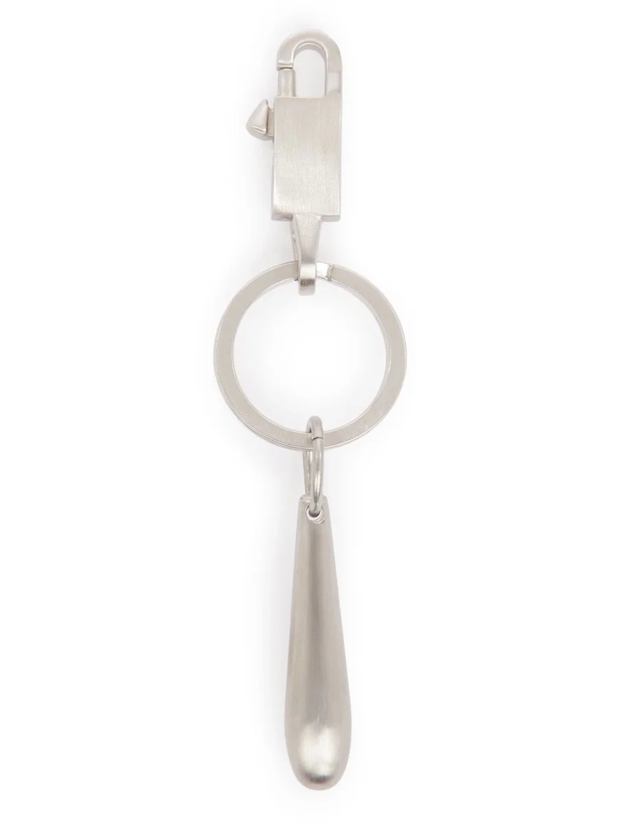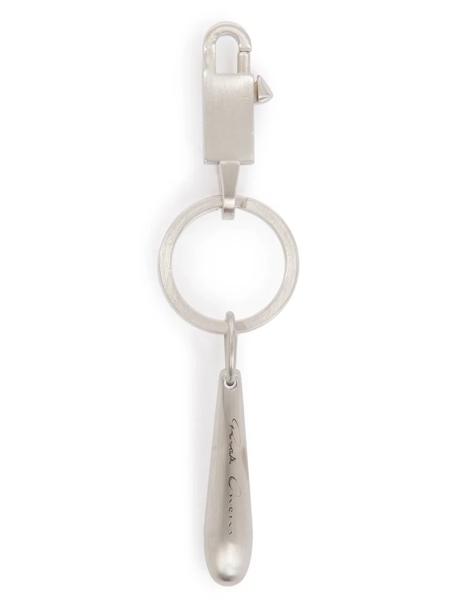 THIS TEARDROP KEYCHAIN FEATURES A SMALL SNAP HOOK, A ROUND KEYRING AND A TEARDROP CHARM ENGRAVED WITH THE RICK OWENS LOGO.