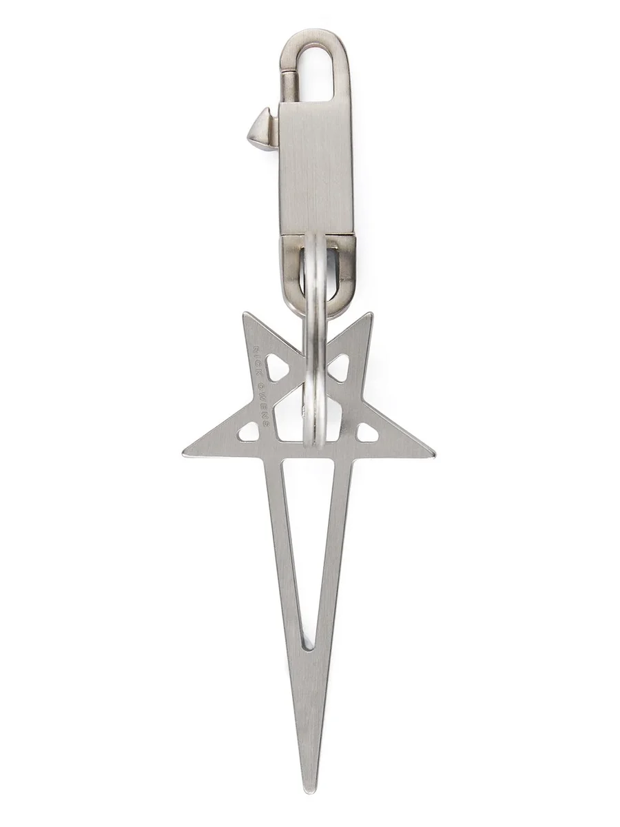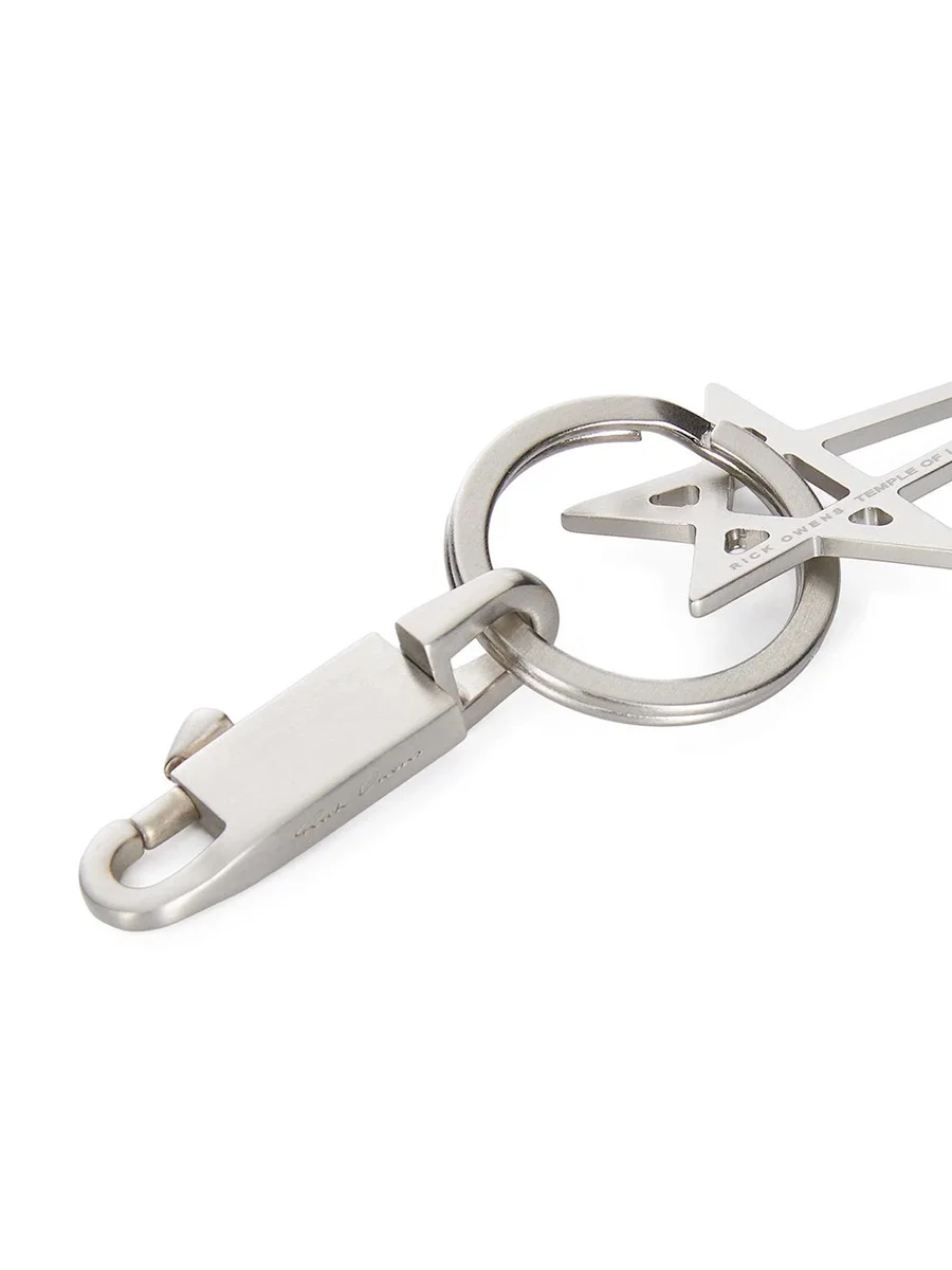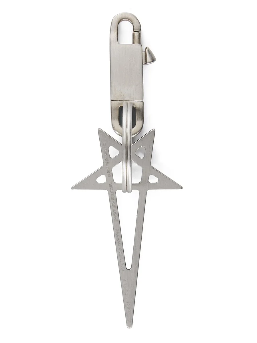 THIS PENTAGRAM KEYCHAIN FEATURES A SMALL HOOK ENGRAVED WITH THE RICK OWENS LOGO AND A ROUND KEYRING WITH A HANGING PENTAGRAM CHARM.