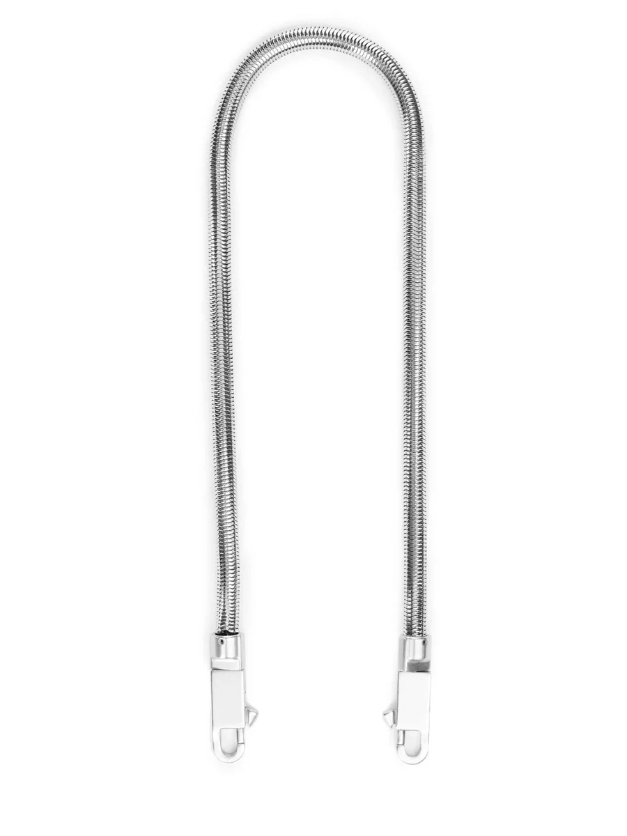 THIS SNAKE CHAIN IS A SHORT STRAP WITH A SNAP HOOK ON EITHER END MADE FROM TUBULAR SNAKE CHAIN. THIS CHAIN IS DESIGNED TO BE SOLD AS AN ADDITION TO ALL OF OUR BAGS WITH DETACHABLE LEATHER STRAPS.