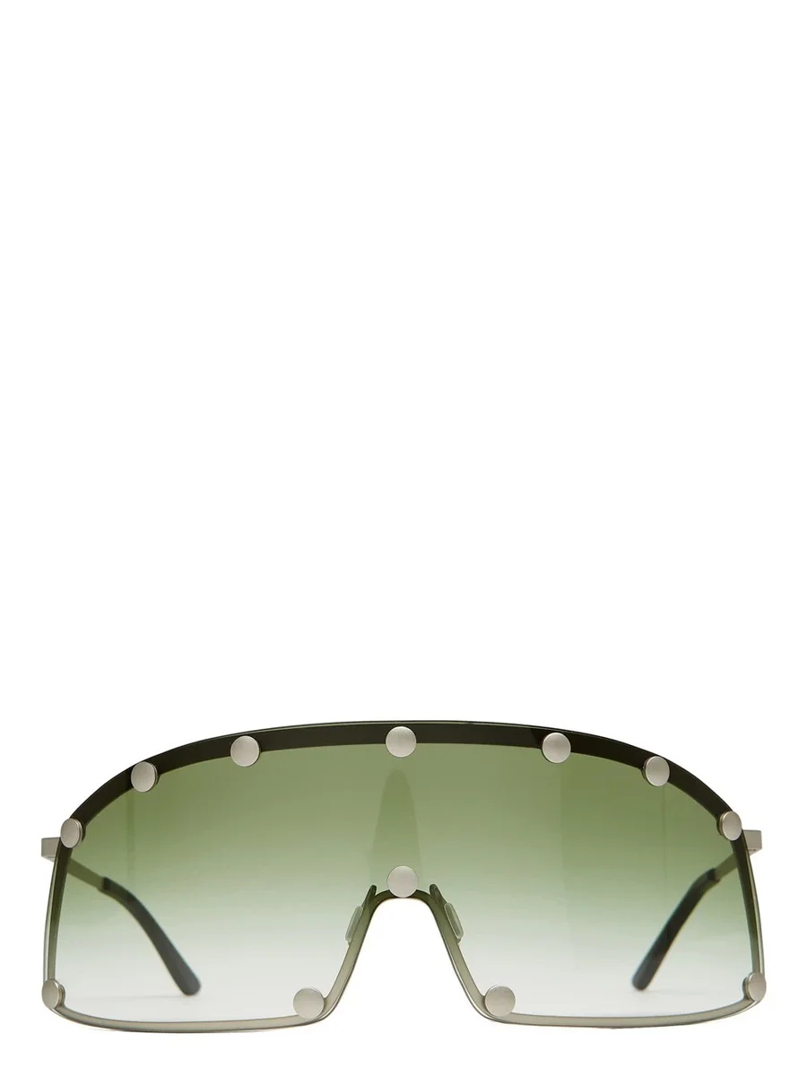 THESE SHIELDING SUNGLASSES FEATURE A METAL FRAME, A SINGLE CORRESPONDING LENS WITH A CURVED TOP AND STRAIGHT BOTTOM SECURED WITH SCREWS AND A RUBBER NOSE PAD. THEY HAVE SLIM METAL ARMS WITH THE RICK OWENS LOGO ON THE INSIDE RIGHT TEMPLE.