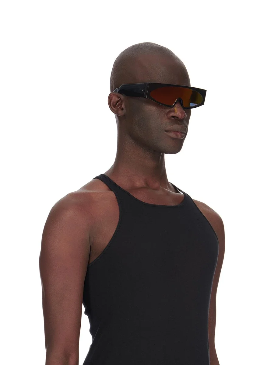 RICK OWENS RETRO FUTURISTIC BLACK RECTANGULAR FRAMED SUNGLASSES FEATURE AN ACETATE FRAME AND PINK LENSES.