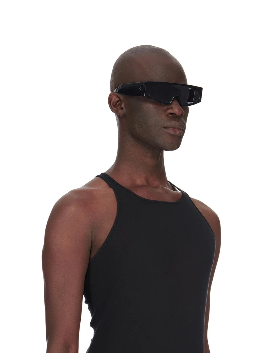 RICK OWENS RETRO FUTURISTIC BLACK RECTANGULAR FRAMED SUNGLASSES FEATURE AN ACETATE FRAME AND SILVER LENSES.