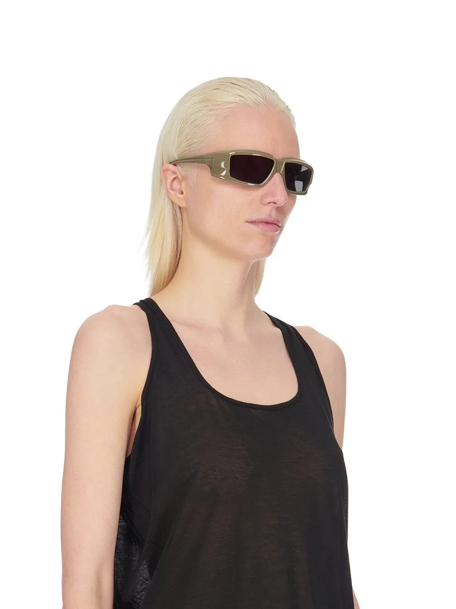 RICK OWENSSUNGLASSES FEATURES A DUST GREY DOUBLE INJECTION JPNYLON FRAME AND BLACK LENSES.