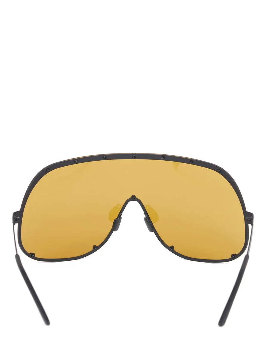 THESE SHIELD SUNGLASSES FEATURE A SURGICAL STAINLESS STEEL FRAME, A SINGLE VOLUMINOUS CURVED CORRESPONDING LENS SECURED WITH SCREWS AND A RUBBER NOSE PAD. THEY HAVE SLIM METAL ARMS WITH THE RICK OWENS LOGO ON THE INSIDE RIGHT TEMPLE. NOT SUITABLE FOR CONVERSION INTO PRESCRIPTION GLASSES.