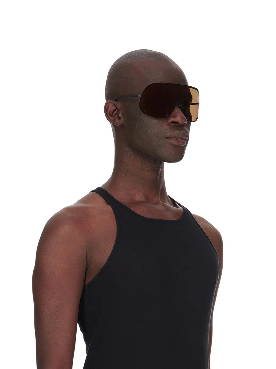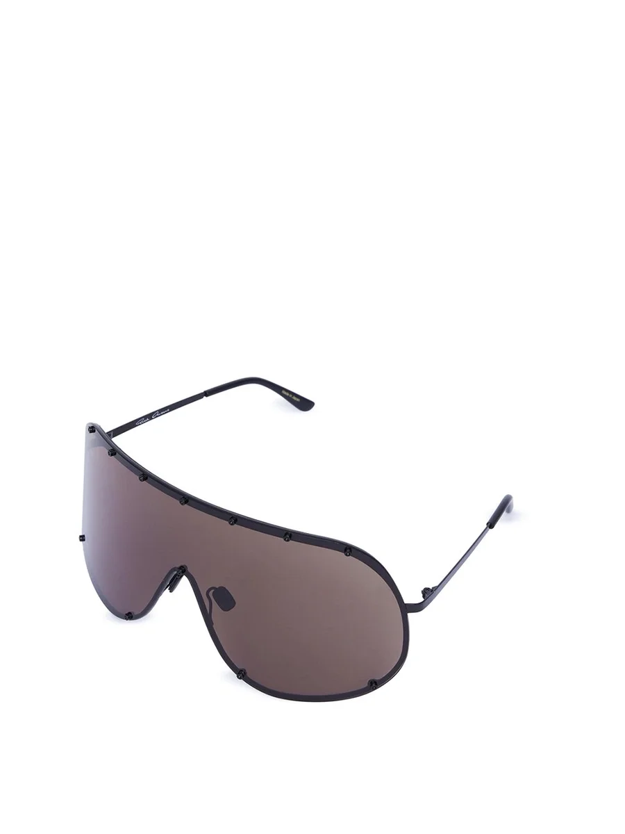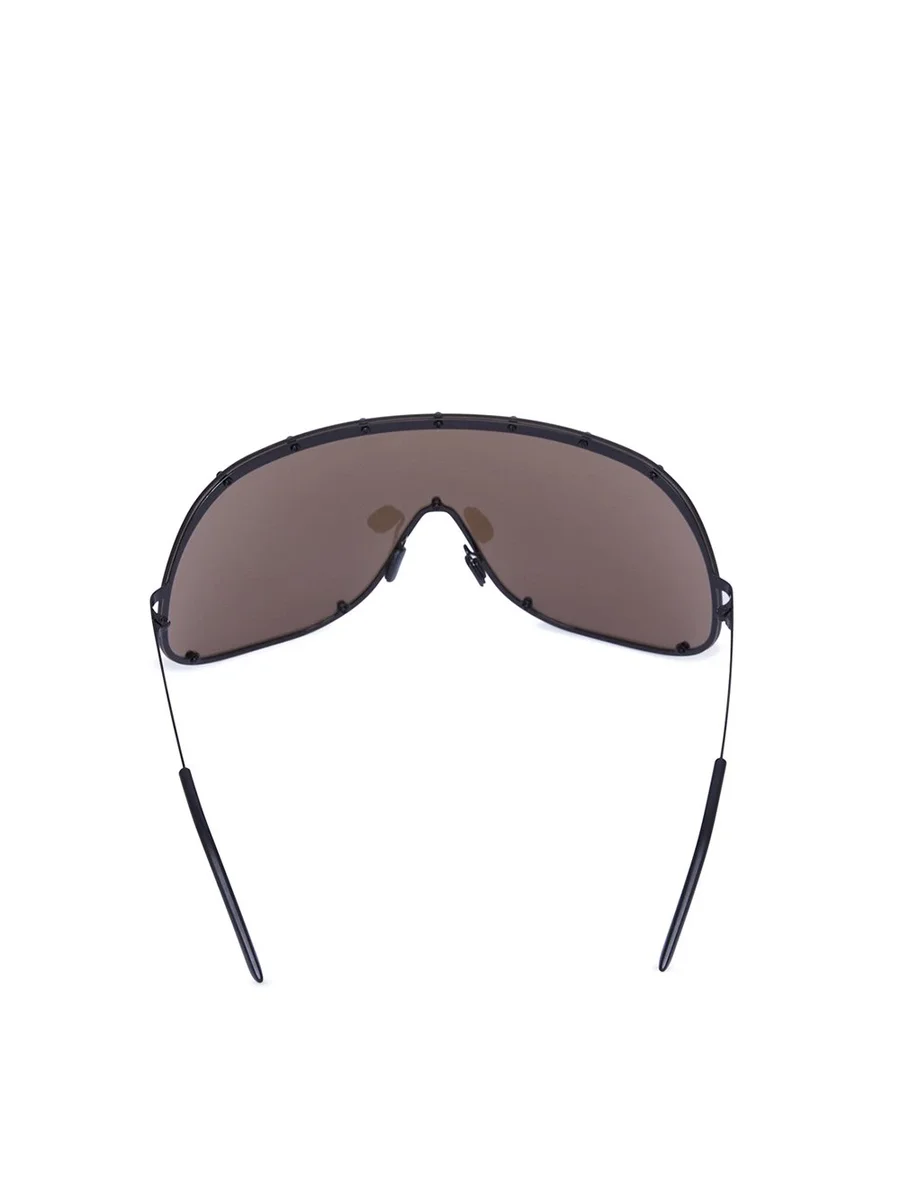 RICK OWENS SHIELD SUNGLASSES FEATURES A BLACK SURGICAL STAINLESS STEEL FRAME , A VOLUMINOUS CURVED BLACK LENS AND A RUBBER NOSE PAD.