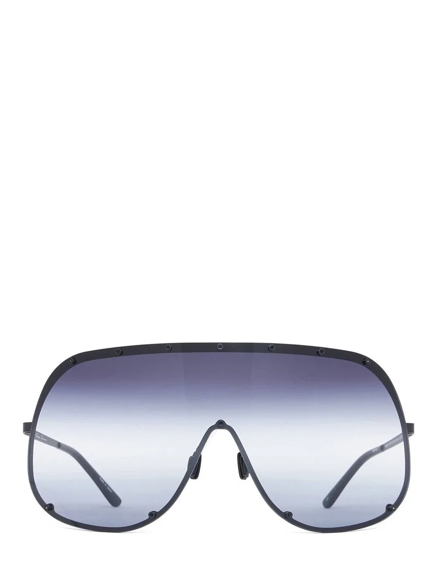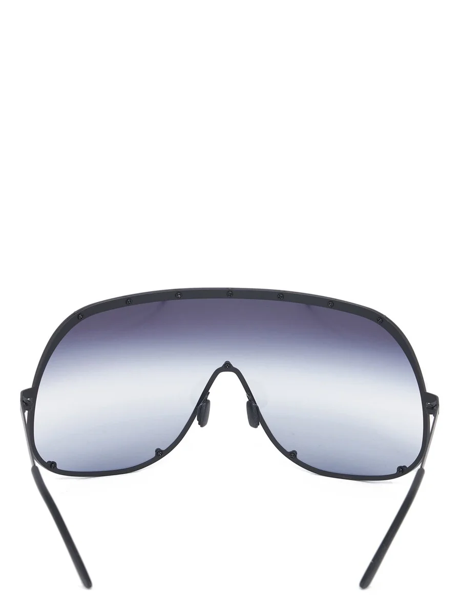THESE SHIELD SUNGLASSES FEATURE A SURGICAL STAINLESS STEEL FRAME, A SINGLE VOLUMINOUS CURVED CORRESPONDING LENS SECURED WITH SCREWS AND A RUBBER NOSE PAD. THEY HAVE SLIM METAL ARMS WITH THE RICK OWENS LOGO ON THE INSIDE RIGHT TEMPLE.