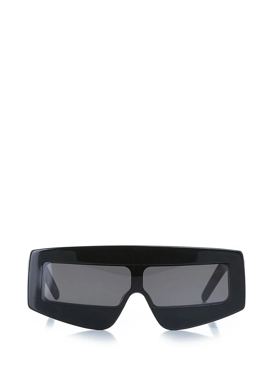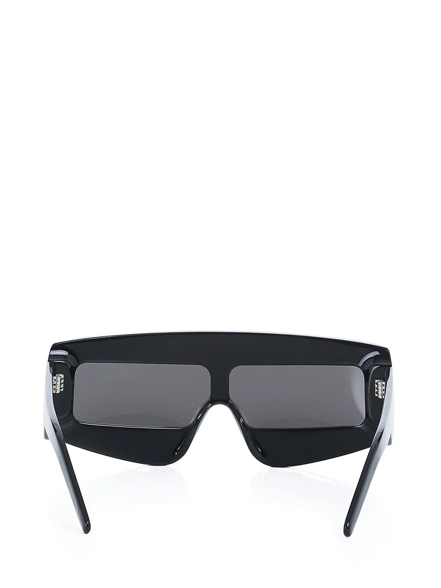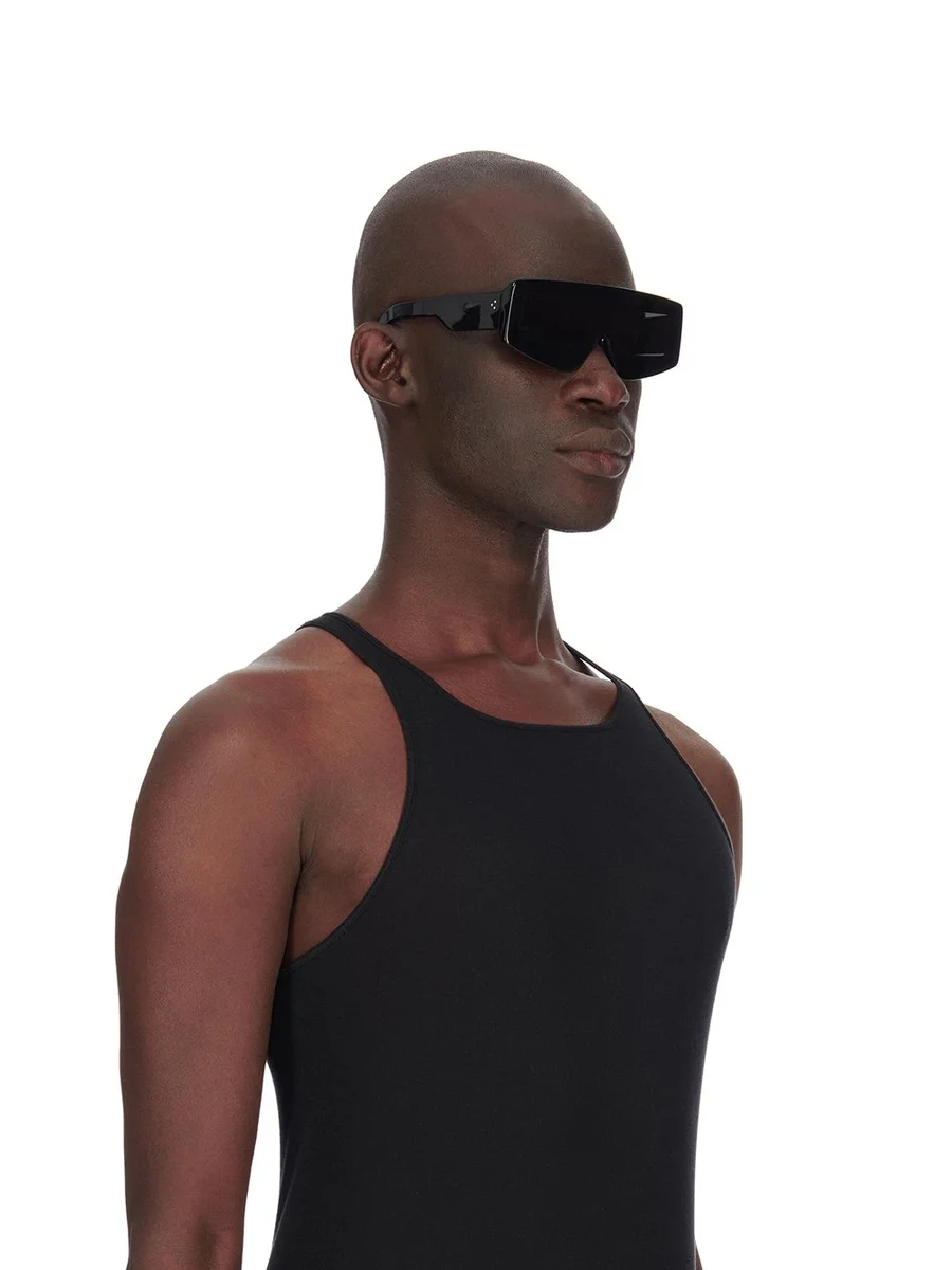 THESE PHLEG SUNGLASSES FEATURE A SINGLE RECTANGULAR LENS SURROUNDED BY A WIDER, SLIGHTLY ROUNDED-EDGE FRAME. THEY HAVE WIDE ARMS WITH THE SIGNATURE TRIO OF SILVER RIVETS ON EACH TEMPLE AND RICK OWENS LOGO ON INSIDE RIGHT.