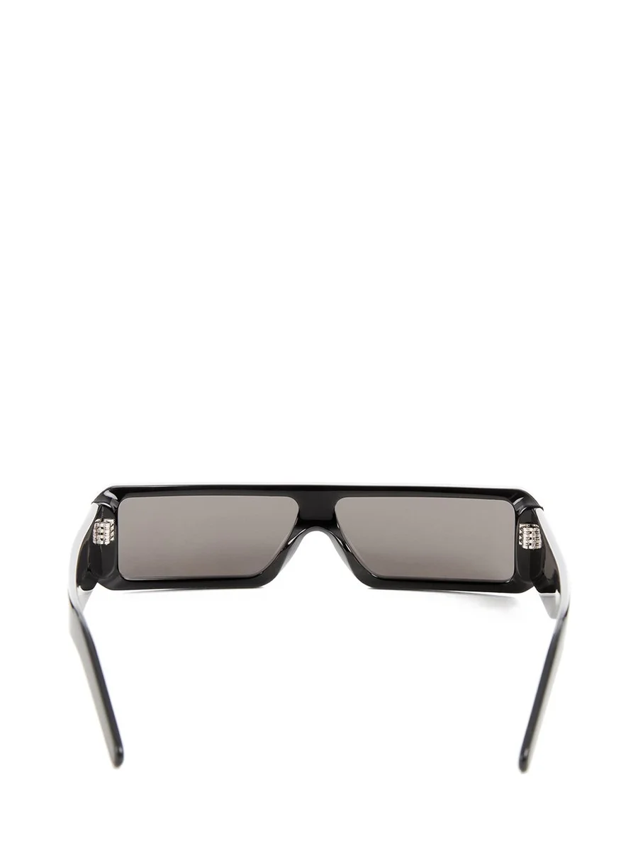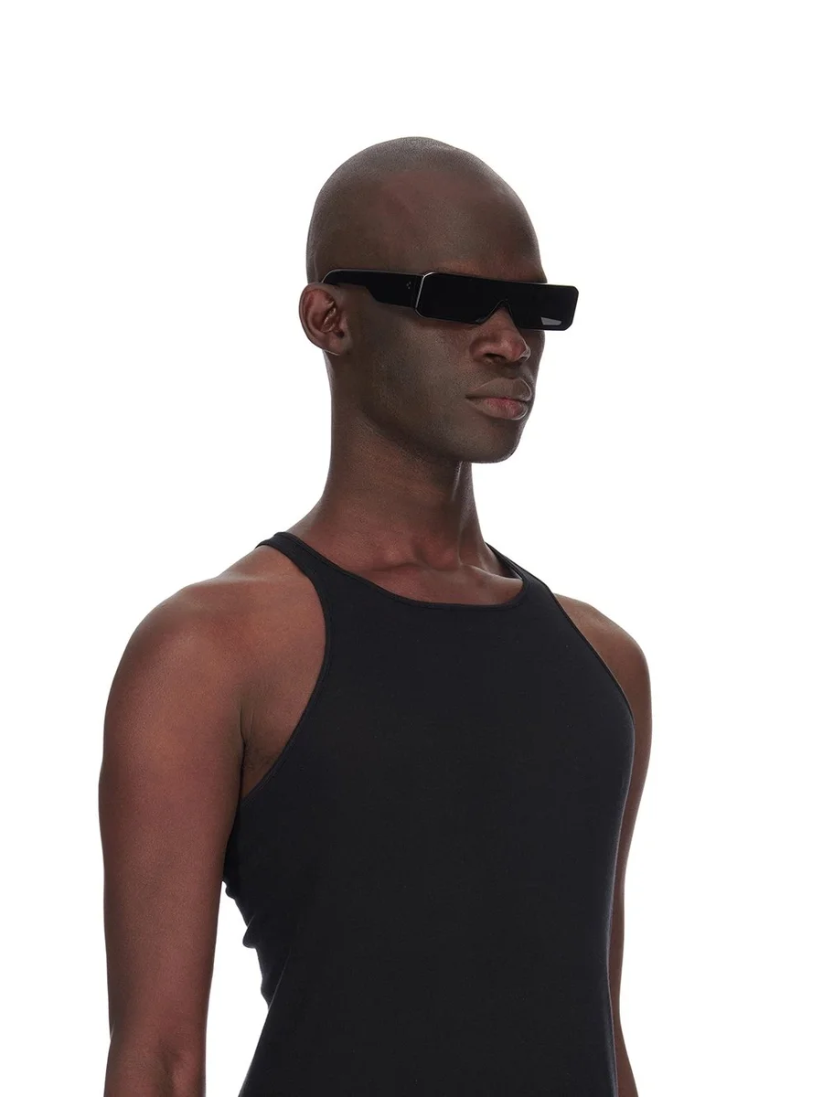 THESE GETH SUNGLASSES FEATURE A SLEEK AND SLIM RECTANGULAR BLACK ACETATE FRAME WITH A SINGLE CUT LENS. THEY HAVE WIDE ARMS WITH THE SIGNATURE TRIO OF SILVER RIVETS ON EACH TEMPLE AND RICK OWENS LOGO ON INSIDE RIGHT.