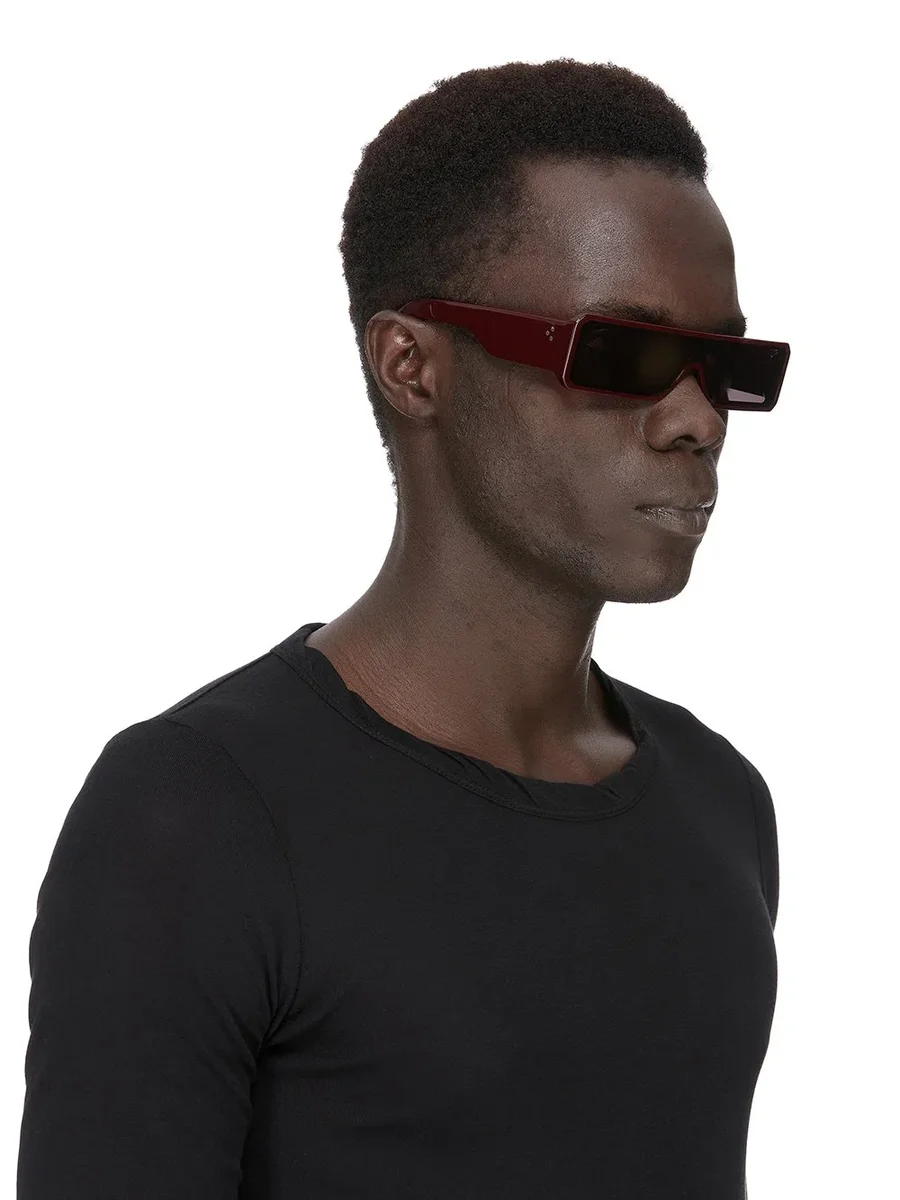 THESE GETH SUNGLASSES FEATURE A SLEEK AND SLIM RECTANGULAR PEARL ACETATE FRAME WITH A SINGLE CUT LENS. THEY HAVE WIDE ARMS WITH THE SIGNATURE TRIO OF SILVER RIVETS ON EACH TEMPLE AND RICK OWENS LOGO ON INSIDE RIGHT.