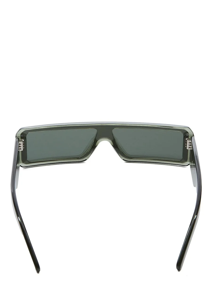 THESE GETH SUNGLASSES FEATURE A SLEEK AND SLIM RECTANGULAR BLACK ACETATE FRAME WITH A SINGLE CUT LENS. THEY HAVE WIDE ARMS WITH THE SIGNATURE TRIO OF SILVER RIVETS ON EACH TEMPLE AND RICK OWENS LOGO ON INSIDE RIGHT.