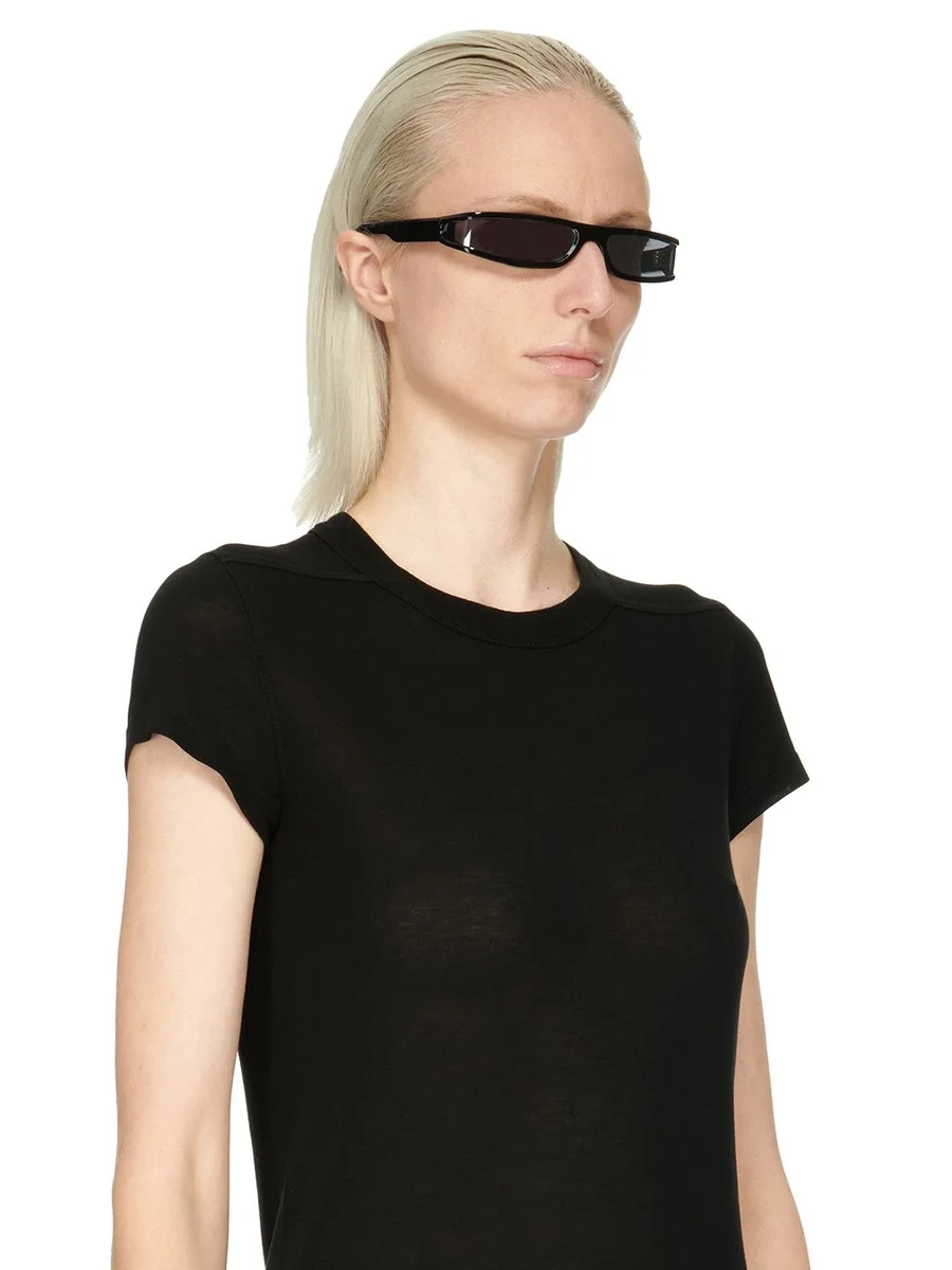 THESE FOG SUNGLASSES ARE SLIM WRAP AROUND FRAME WITH LENS THAT FOLDS AROUND THE TEMPLE. THEY HAVE SLIM ARMS AND RICK OWENS LOGO ON EACH TEMPLE.