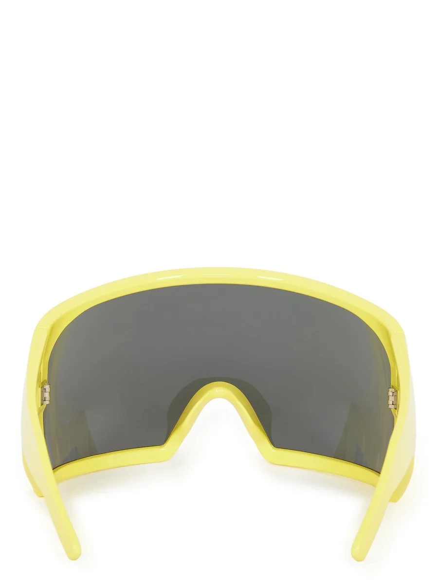 THESE KRIESTER SUNGLASSES ARE LARGE CURVED WRAP AROUND FRAMES WITH A SINGLE VOLUMINOUS CURVED LENS. THEY HAVE THICK ANGLED ARMS AND THE RICK OWENS LOGO ON THE RIGHT SIDE.
