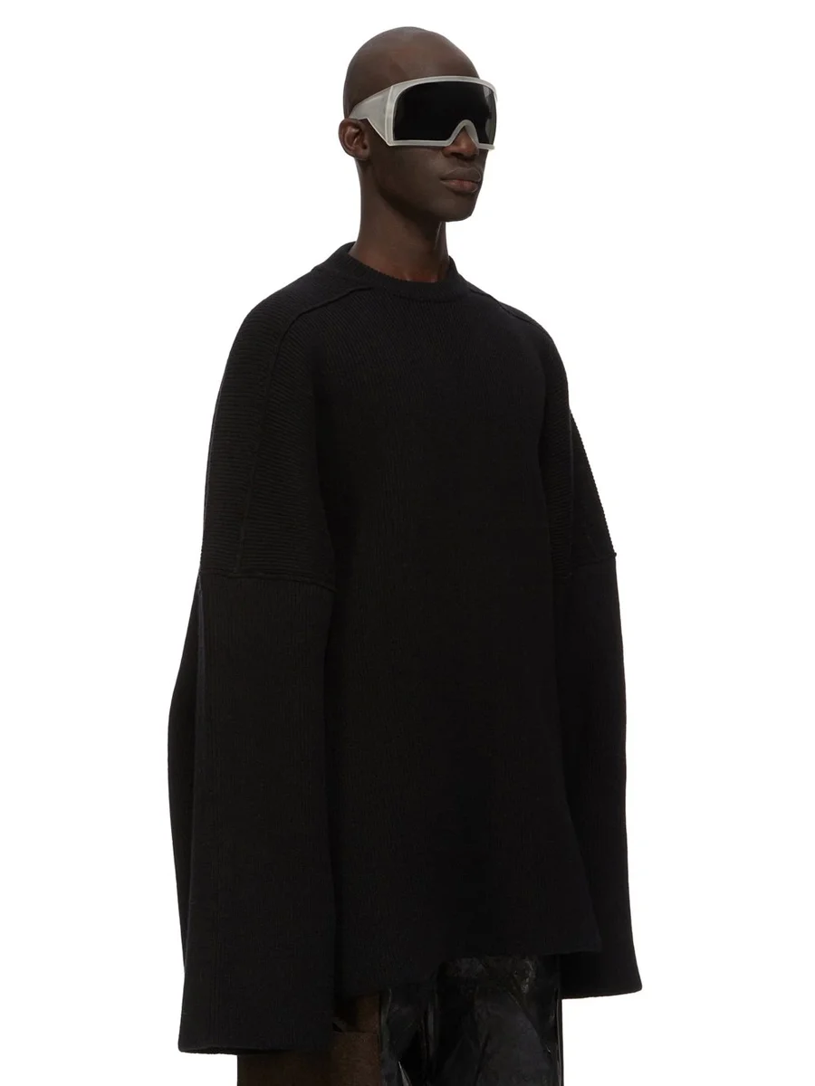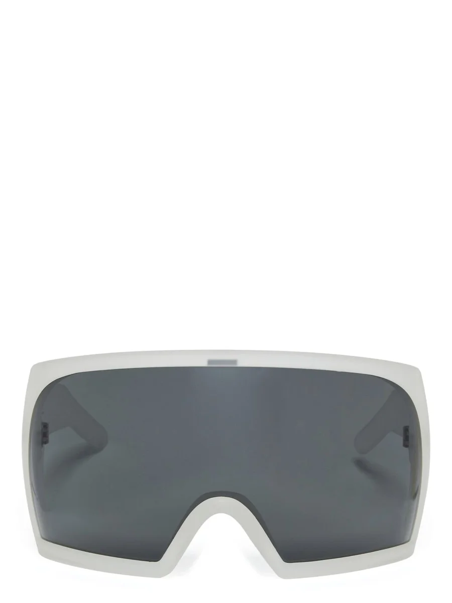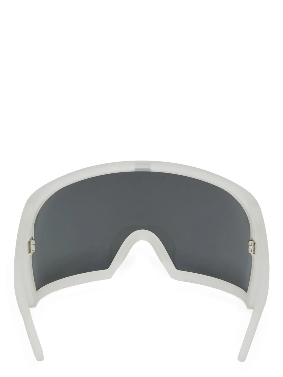 THESE KRIESTER SUNGLASSES ARE LARGE CURVED WRAP AROUND FRAMES WITH A SINGLE VOLUMINOUS CURVED LENS. THEY HAVE THICK ANGLED ARMS AND THE RICK OWENS LOGO ON THE RIGHT SIDE.