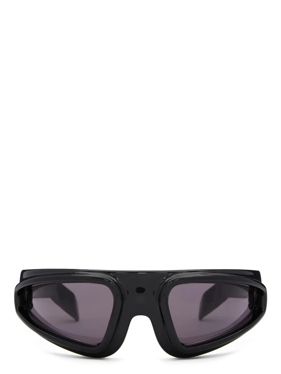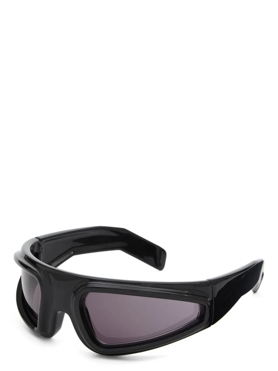 THESE RYDER SUNGLASSES ARE A PAIR OF WRAP-AROUND FRAMES WITH AN EMPHASIS ON PERIPHERAL SIGHT. THEY FEATURE A BOLD STRAIGHT EYEBROW RIDGE, WITH DEEP SET LENSES EDGED WITH A THICK PROTRUDING FRAME AND RICK OWENS SIGNATURE THICK ANGLED ARMS WITH LOGO ON INSIDE RIGHT.