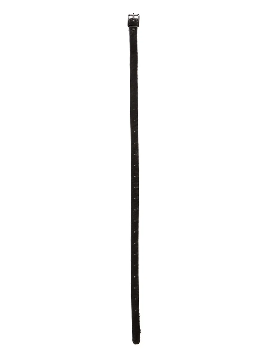THIS CHOKER IS MADE FROM A STRAP OF HEAVYWEIGHT HAIR-ON COWHIDE. IT IS ADJUSTABLE WITH NINETEEN HOLES AND A SMALL BUCKLE AT ONE END. IT IS EMBOSSED WITH THE RICK OWENS LOGO.