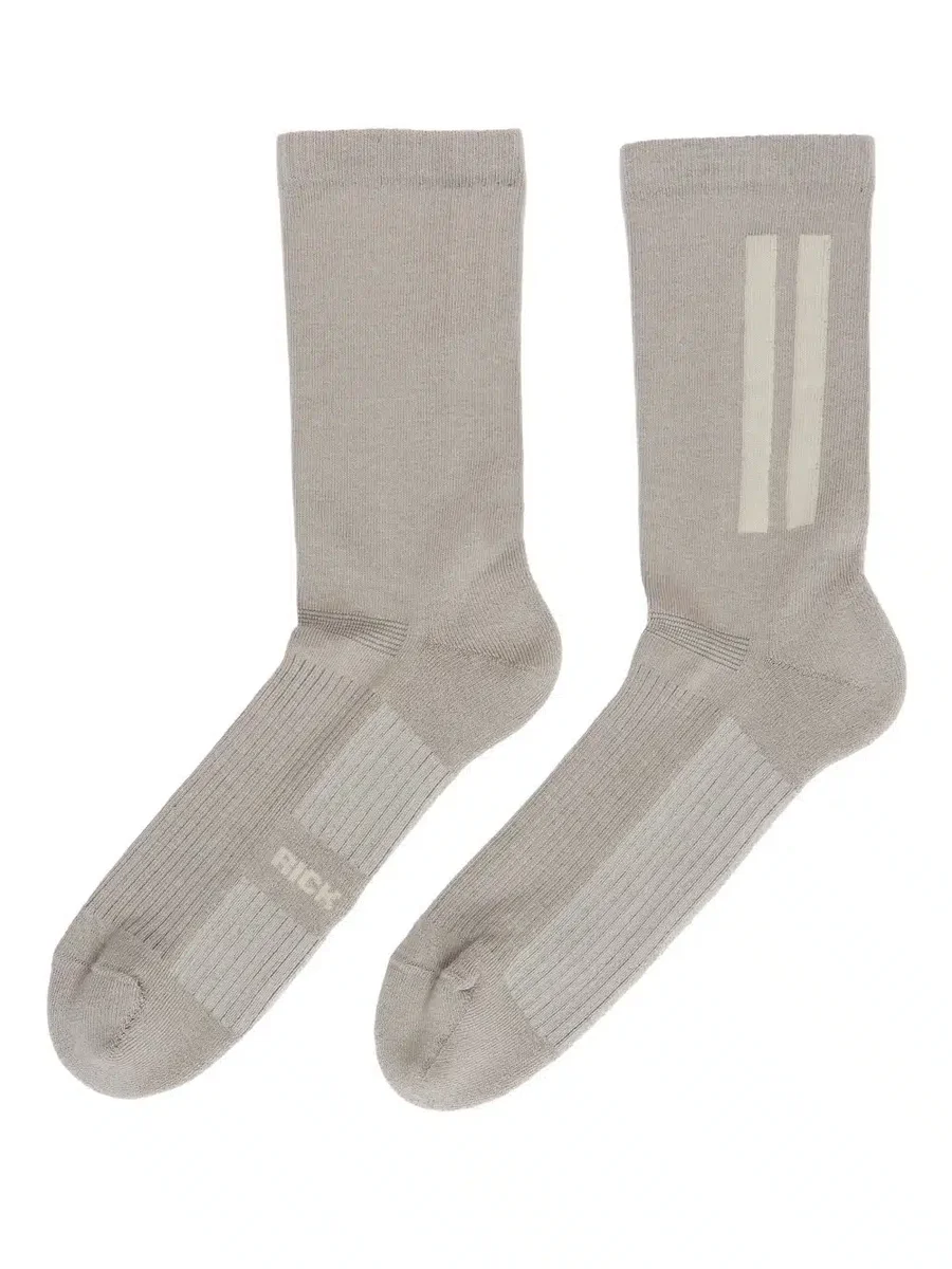 THESE GLITTER SOCKS ARE SHORT-LENGTH. THEY FEATURE SIGNATURE DOUBLE LINES ON THE OUTER ANKLE OF THE LEFT SOCK, THE WORDS “RICK OWENS” ON THE BOTTOM OF THE RIGHT SOCK AND WHITE SOLES ON BOTH.