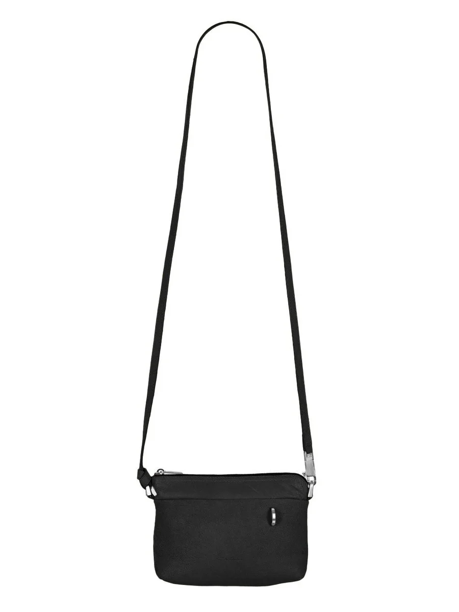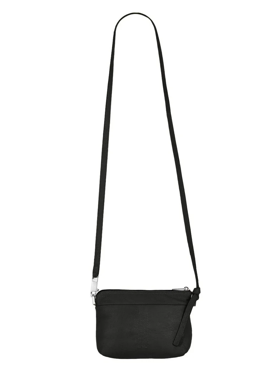 THIS SMALL ADRI IS A RECTANGULAR POUCH WITH TOP ZIPPER CLOSURE, A PONTICELLO D-LOOP DETAIL AND A LONG, THIN, ADJUSTABLE LEATHER STRAP, WITH SMALL PALLADIUM TONE BRASS SNAP HOOKS AND D-RINGS.