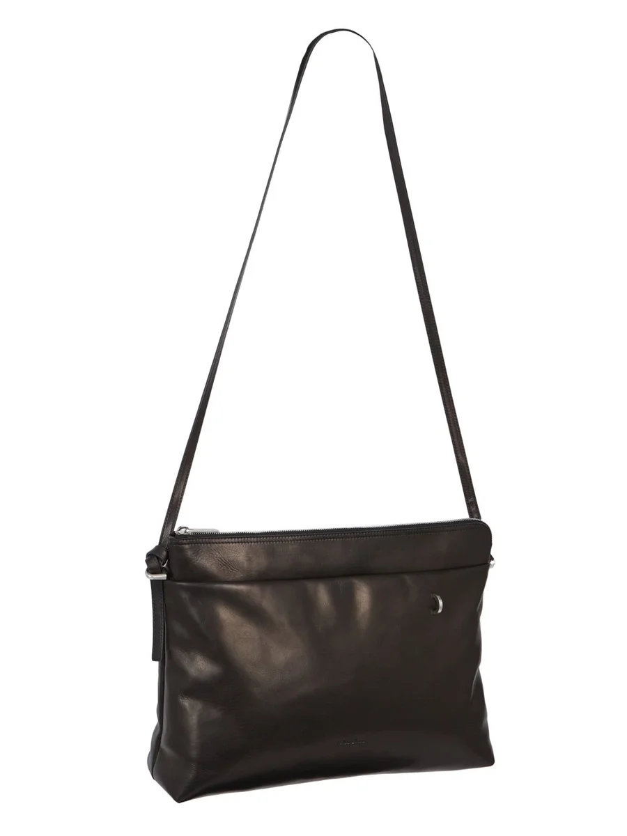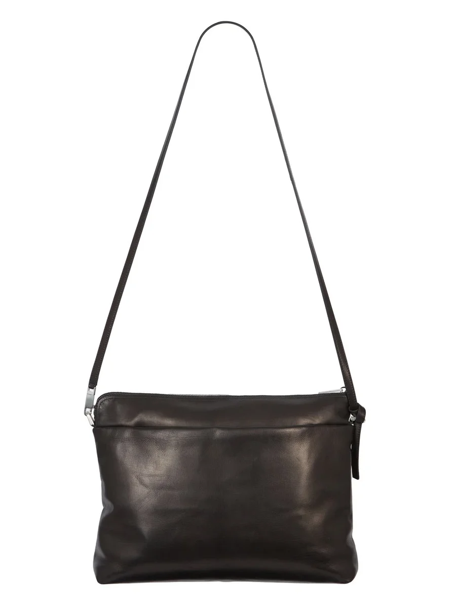 THIS BIG ADRI IS A RECTANGULAR POUCH WITH TOP ZIPPER CLOSURE, A PONTICELLO D-LOOP DETAIL AND A LONG, THIN, ADJUSTABLE LEATHER STRAP, WITH SMALL PALLADIUM TONE BRASS SNAP HOOKS AND D-RINGS.