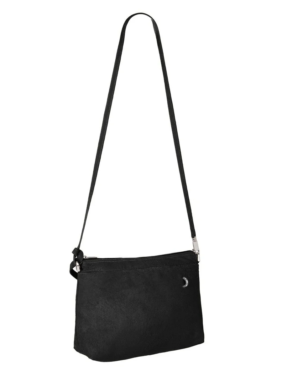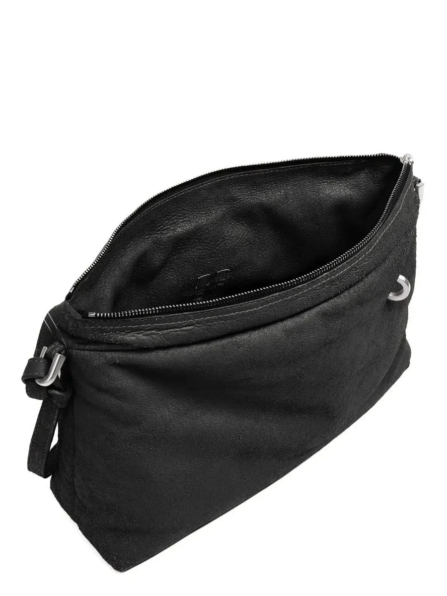 THIS ADRI IS A RECTANGULAR POUCH WITH TOP ZIPPER CLOSURE, A PONTICELLO D-LOOP DETAIL AND A LONG, THIN, ADJUSTABLE LEATHER STRAP, WITH SMALL PALLADIUM TONE BRASS SNAP HOOKS AND D-RINGS.