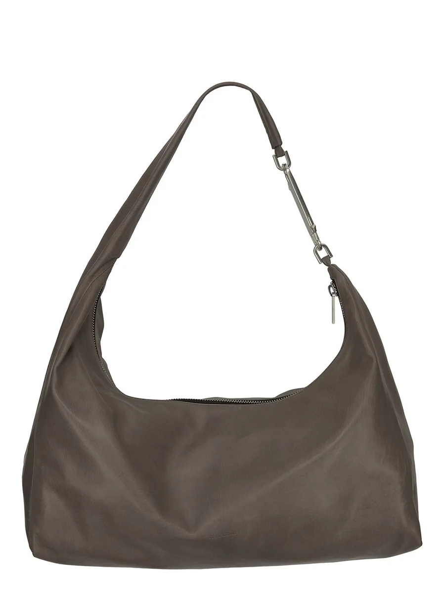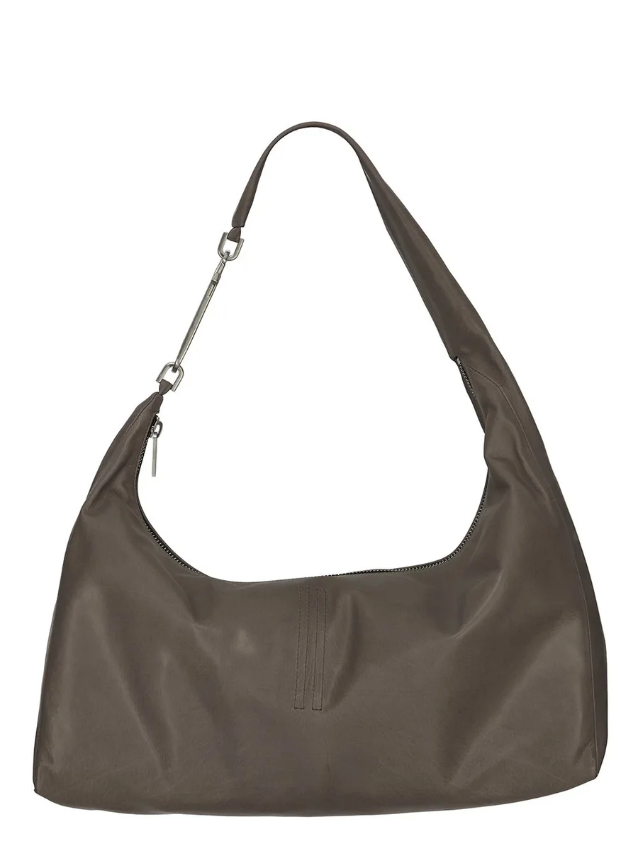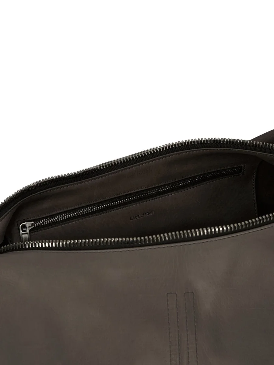 THIS GEMINI CROPPED BAG IS A SMALLER VERSION OF OUR LARGE GEMINI BAG. IT IS A SOFT A-SHAPED BAG THAT SLOUCHES IN THE MIDDLE. IT CURVES OVER TO CREATE A STRAP THAT SECURES WITH A GEMINI DOUBLE-ENDED SNAP HOOK ENGRAVED WITH THE RICK OWENS LOGO. THE BAG OPENS WITH A TOP ZIP, HAS AN INNER POUCH POCKET, AND A FLAT POCKET WITH SIGNATURE U-SHAPED STITCHING DETAIL VISIBLE ON THE REAR EXTERIOR.