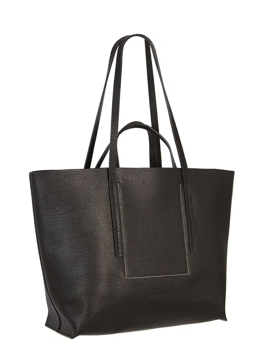 THIS SHOPPER IS A HORIZONTAL RECTANGULAR TOTE BAG WITH AN OPEN TOP. IT HAS TWO LONG HANDLES INTENDED FOR A SHOULDER CARRY AND TWO SHORT HAND CARRY HANDLES. IT HAS AN INNER ZIPPERED POCKET AND A INNER FLAT POCKET WITH SIGNATURE U-SHAPED STITCHING DETAIL VISIBLE ON THE FRONT. IT IS EMBOSSED WITH THE RICK OWENS LOGO.