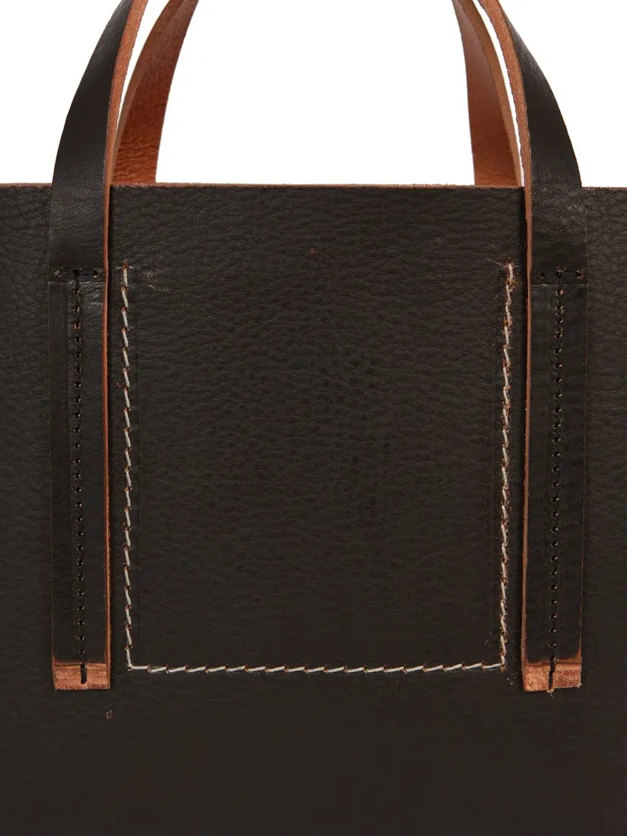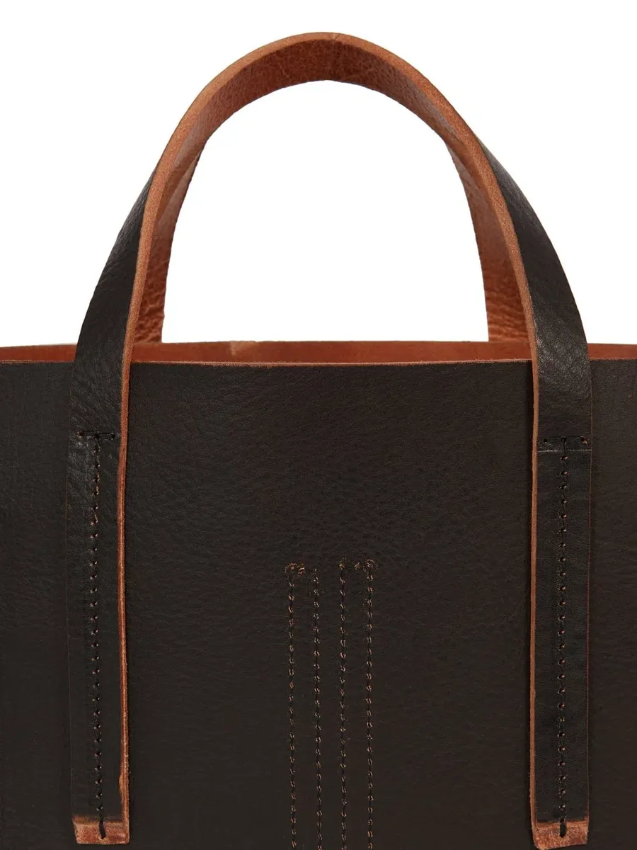 THIS MINI SHOPPER IS A HORIZONTAL RECTANGULAR BAG WITH TWO SHORT CARRY HANDLES AND AN OPEN TOP. IT HAS AN INNER ZIPPERED POCKET AND A INNER FLAT POCKET WITH SIGNATURE U-SHAPED STITCHING DETAIL VISIBLE ON THE FRONT. IT IS EMBOSSED WITH THE RICK OWENS LOGO.