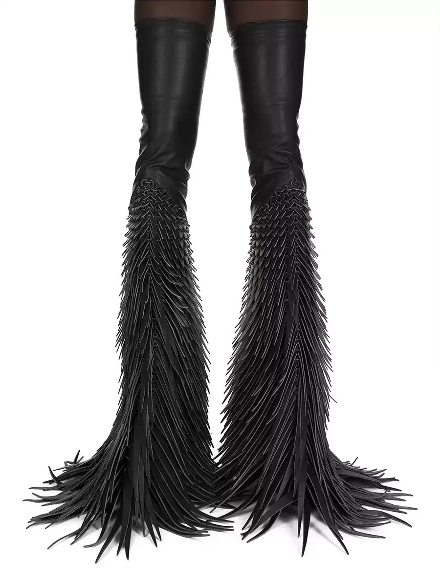 THIS CHAIN MAIL FOR TACO KISS ATTACHES TO THE FRONT OF THE TACO KISS USING THREE SNAP, HIDDEN ON THE INNER TOP SIDE. IT THEN DRAPES OVER THE LOWER LEG, COVERING THE KISS BOOT, LEAVING ONLY THE HEEL VISIBLE.