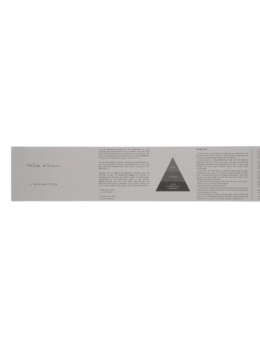 L’APPARITION FRAGRANCE HAS KEY NOTES OF LOTUS, LABDANUM, MYRRH, FRANKINCENSE AND AMBERGRIS.