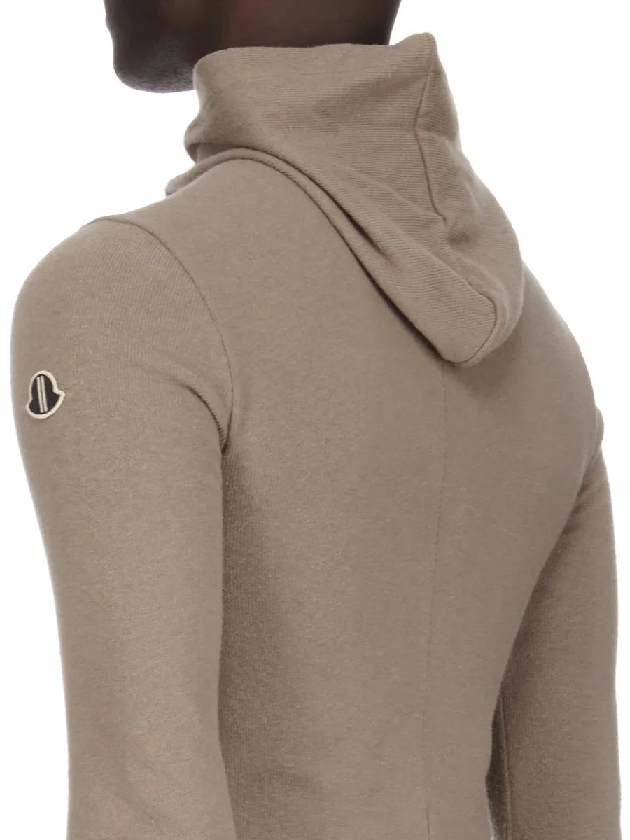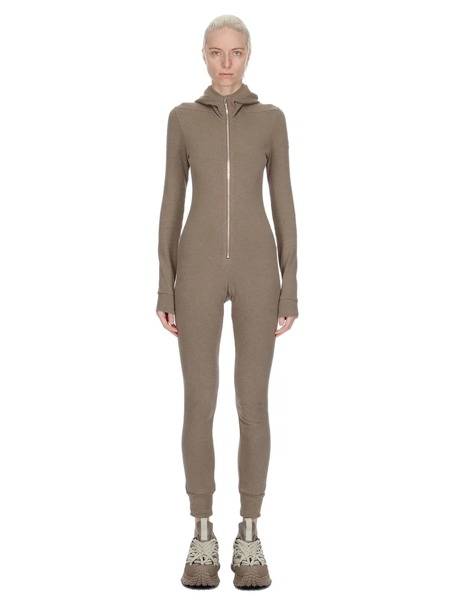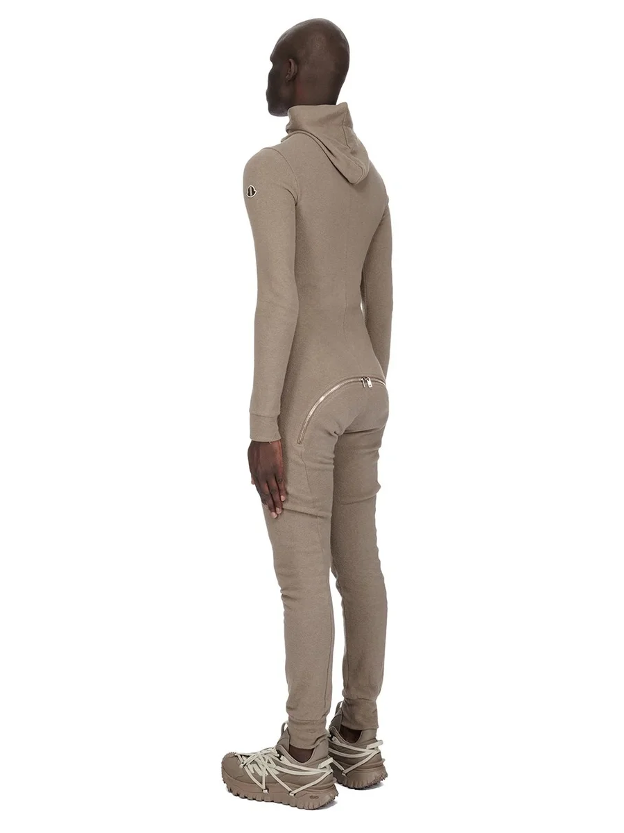 THESE LONGJOHNS ARE FULL LENGTH WITH LONG SLEEVES AND A CLOSE TO THE BODY FIT. THEY HAVE A CENTRE FRONT ZIPPER, HOOD, LEVEL SHOULDER SEAMS, RIB CUFFS AND ANKLES. THEY FEATURE A ZIPPER RUNNING FROM CENTRE BUTT, CURVING AROUND TO FINISH ON THE OUTER HIP. THEY CAN BE WORN AS A FULL COVER-ALL, OR STYLED PEELED DOWN TO THE HIPS. IT HAS THE MONCLER +RICK OWENS EMBROIDERED LOGO PATCH ON THE UPPER LEFT ARM.