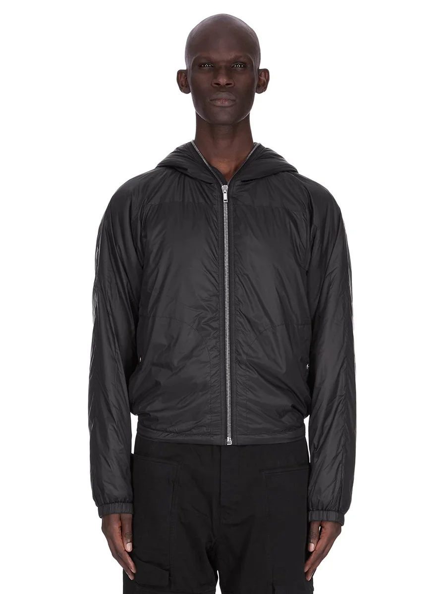 THIS SEALED WINDBREAKER IS HIP-LENGTH WITH LONG SLEEVES. IT FEATURES A CENTRE FRONT ZIPPER THAT RUNS UP AND AROUND THE HOOD, SO THAT IT CAN CLOSE COMPLETELY OVER THE FACE. IT HAS TWO LARGE SIDE FRONT POCKETS WITH ROUNDED TOPSTITCHING AND VISIBLE SNAP CLOSURE, SIGNATURE CENTRE FRONT SEAM AND ELASTICIZED CUFF AND HEM. THIS VERSION IS PADDED AND HAS INTERNAL SNAP POCKETS.
