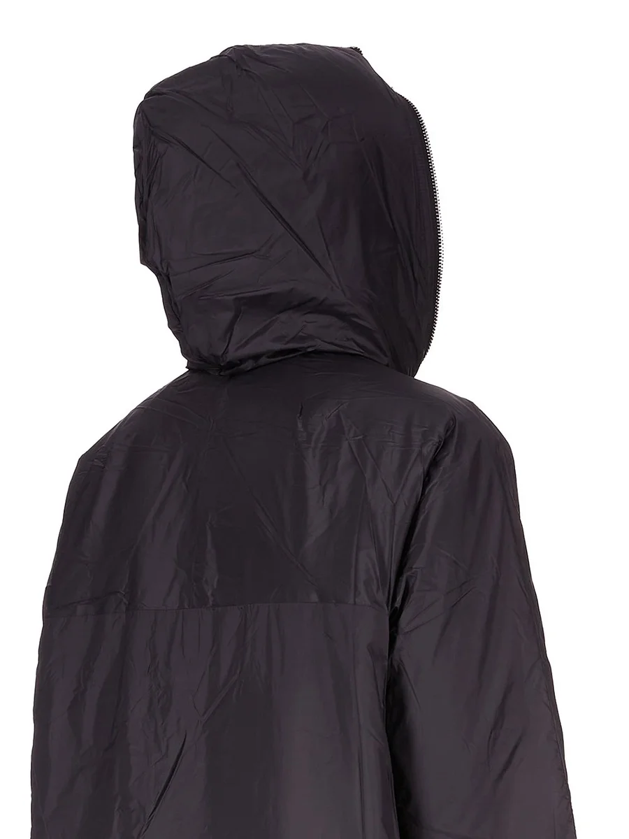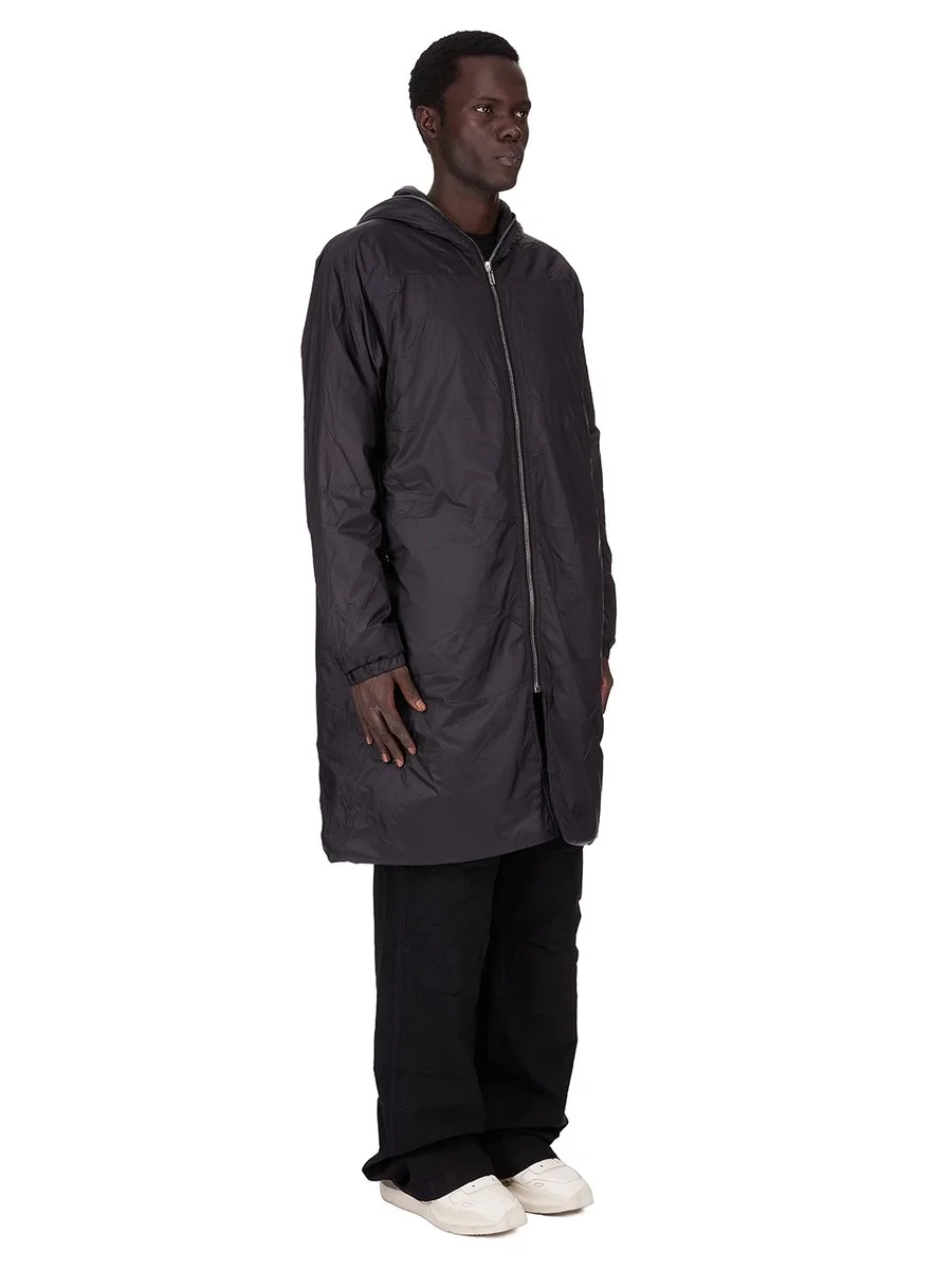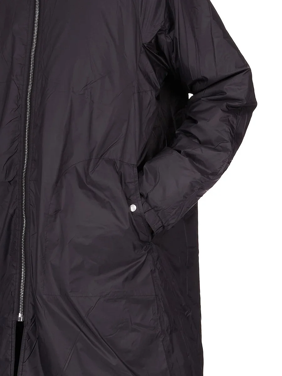 THIS SEALED WINDBREAKER COAT IS KNEE LENGTH WITH LONG SLEEVES. IT FEATURES A CENTRE FRONT ZIPPER THAT RUNS UP AND AROUND THE HOOD, SO THAT IT CAN CLOSE COMPLETELY OVER THE FACE. IT HAS TWO LARGE SIDE FRONT POCKETS WITH ROUNDED TOPSTITCHING AND VISIBLE SNAP CLOSURE, SIGNATURE CENTRE FRONT SEAM AND ELASTICIZED CUFF AND HEM. THIS VERSION IS PADDED AND HAS INTERNAL SNAP POCKETS.