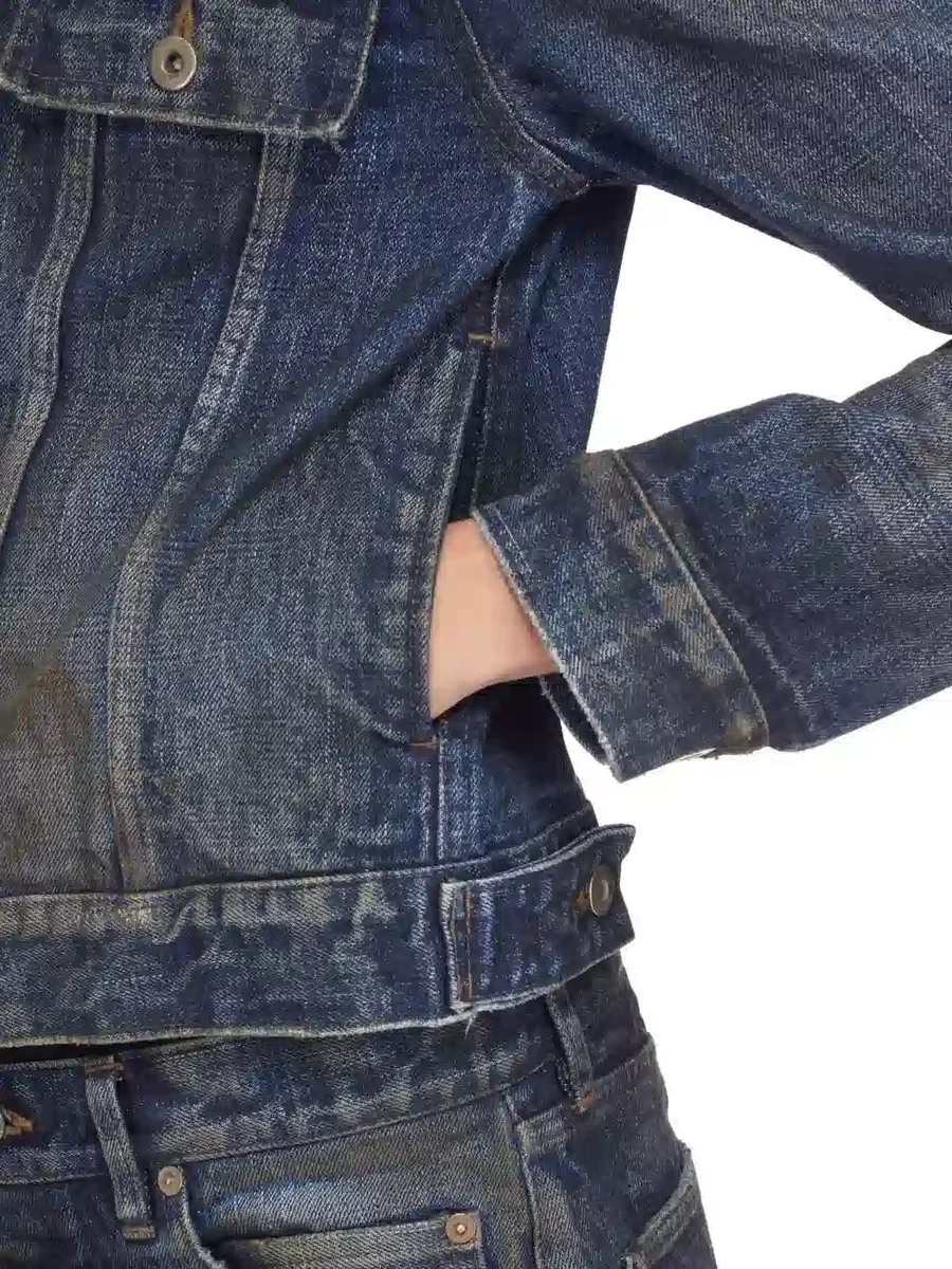 THIS HEAVYWEIGHT 16,5OZ INDIGO DENIM HAS A VINTAGE TREATMENT, APPLIED TO THE COMPLETED GARMENT, CREATED BY HAND IN KURASHIKI CITY, OKAYAMA PREFECTURE, JAPAN, BY SHAVE CO LTD.