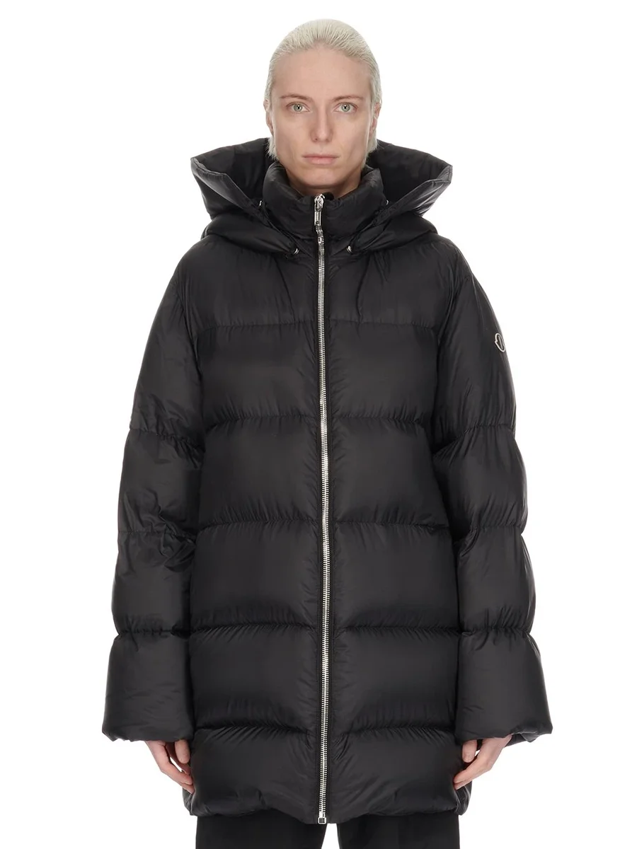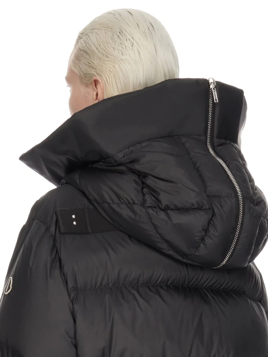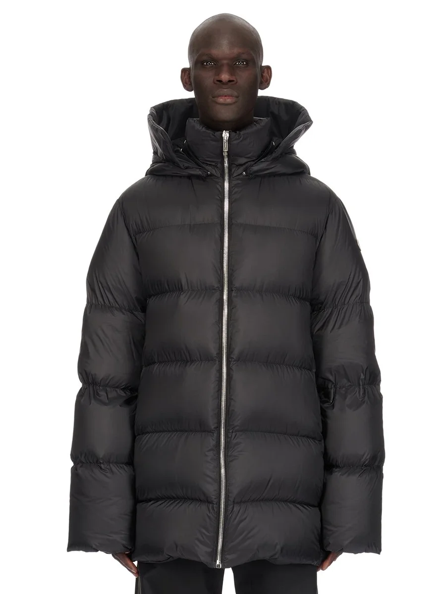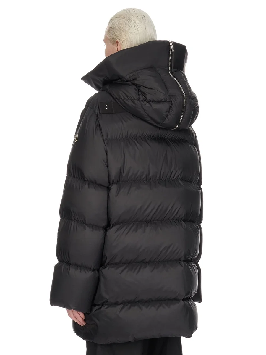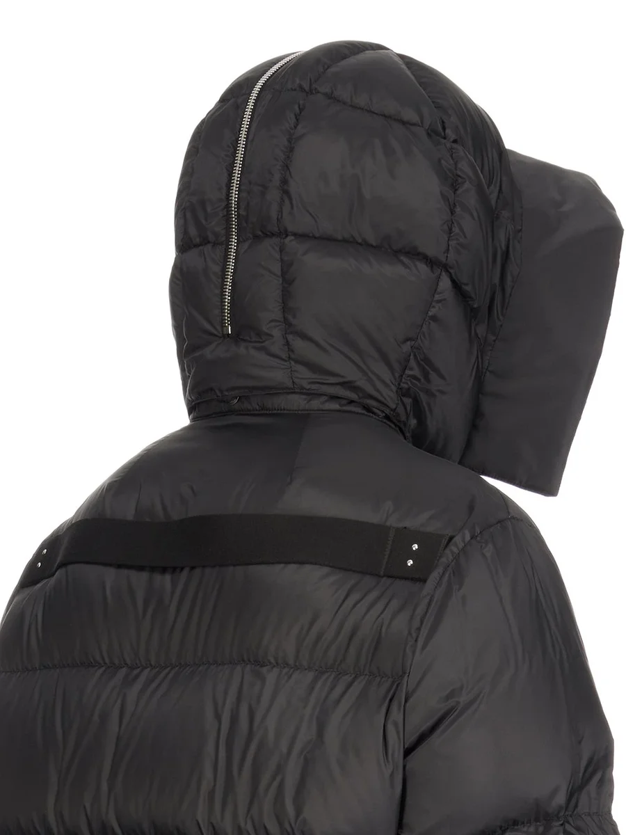 THIS HOODED CYCLOPIC COAT IS MID-THIGH LENGTH WITH A CENTRE FRONT ZIPPER AND A HIGH TURTLE-NECK COLLAR. IT IS A PADDED DUVET QUILTED WITH HORIZONTAL STITCHING LINES AND HAS SIDE FRONT WELT POCKETS WITH SNAPS. IT HAS A LARGE HOOD WITH A CENTRE ZIPPER THAT CAN BE WORN OPEN TO CREATE A LARGE COLLAR OVER THE SHOULDERS. IT FEATURES A SIGNATURE COTTON WEBBING STRAP WITH RIVET DETAIL ON THE BACK YOKE. IT HAS TWO INSIDE POCKETS WITH SNAPS AND THE MONCLER +RICK OWENS EMBROIDERED LOGO PATCH ON THE UPPER LEFT ARM.