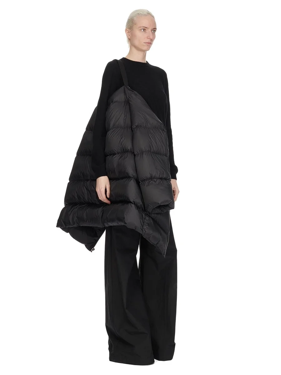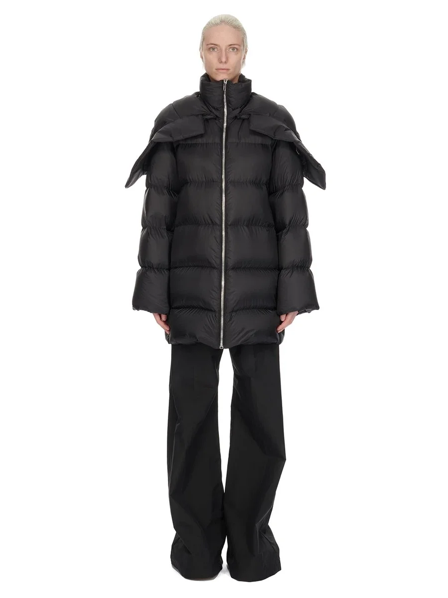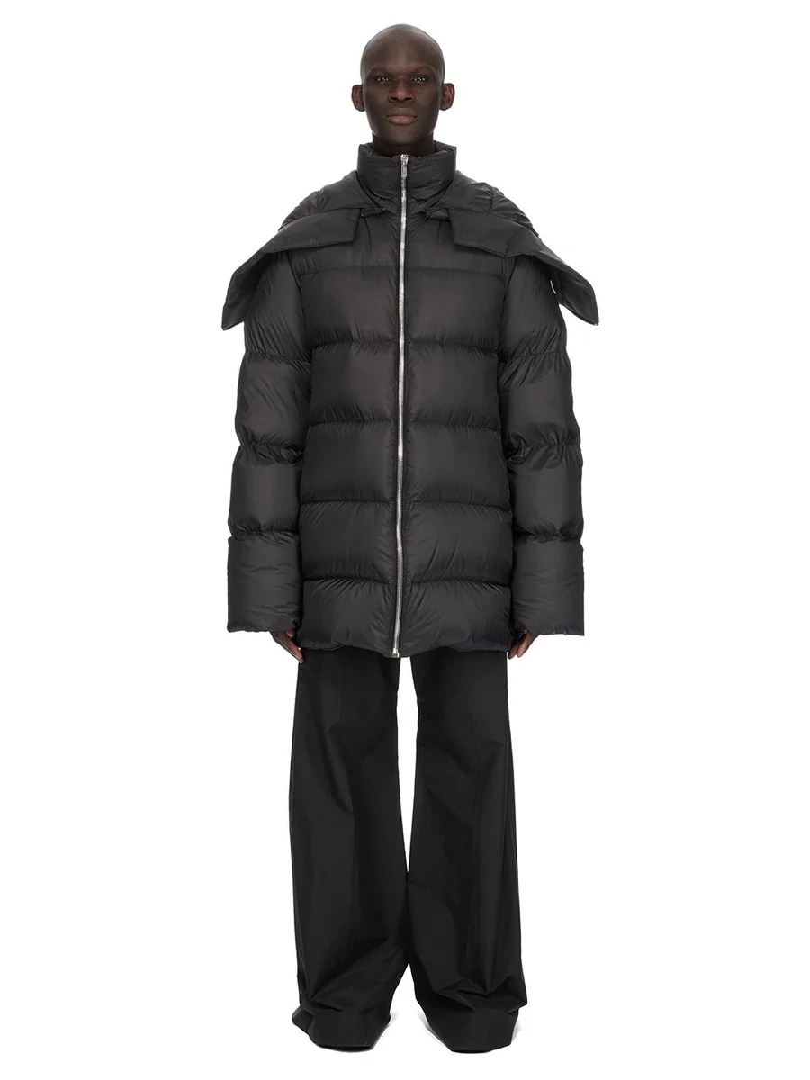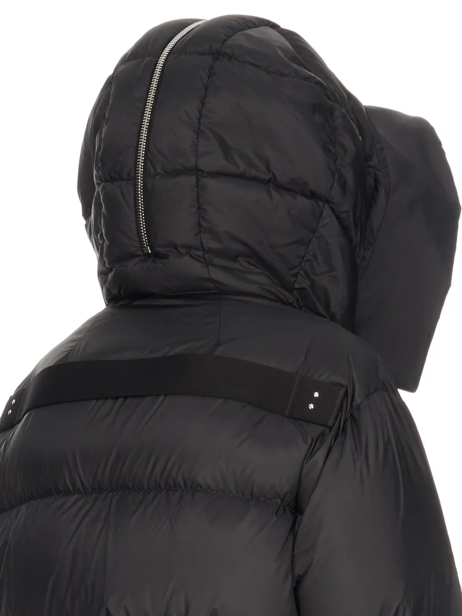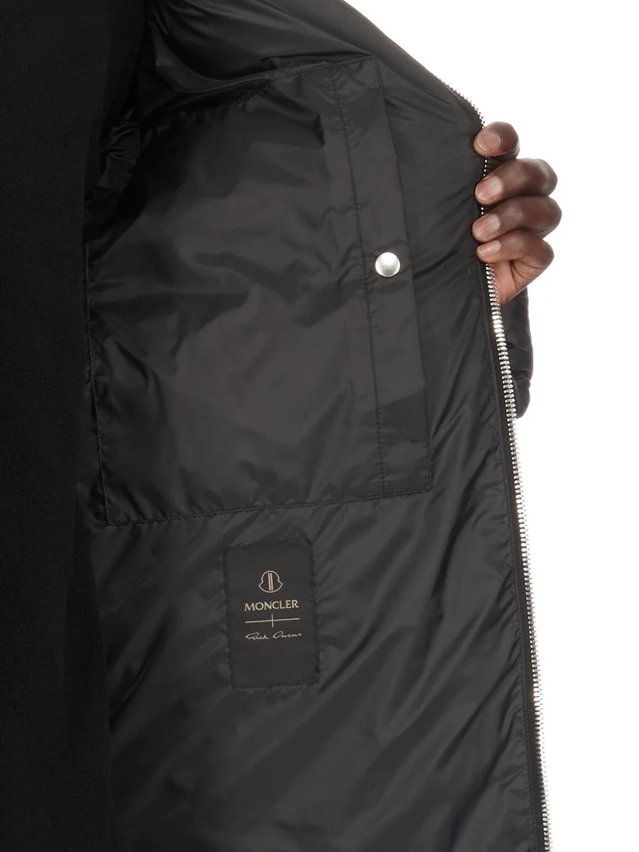 THIS HOODED CYCLOPIC COAT IS MID-THIGH LENGTH WITH A CENTRE FRONT ZIPPER AND A HIGH TURTLE-NECK COLLAR. IT IS A PADDED DUVET QUILTED WITH HORIZONTAL STITCHING LINES AND HAS SIDE FRONT WELT POCKETS WITH SNAPS. IT HAS A LARGE HOOD WITH A CENTRE ZIPPER THAT CAN BE WORN OPEN TO CREATE A LARGE COLLAR OVER THE SHOULDERS. IT FEATURES A SIGNATURE COTTON WEBBING STRAP WITH RIVET DETAIL ON THE BACK YOKE. IT HAS TWO INSIDE POCKETS WITH SNAPS AND THE MONCLER +RICK OWENS EMBROIDERED LOGO PATCH ON THE UPPER LEFT ARM.
