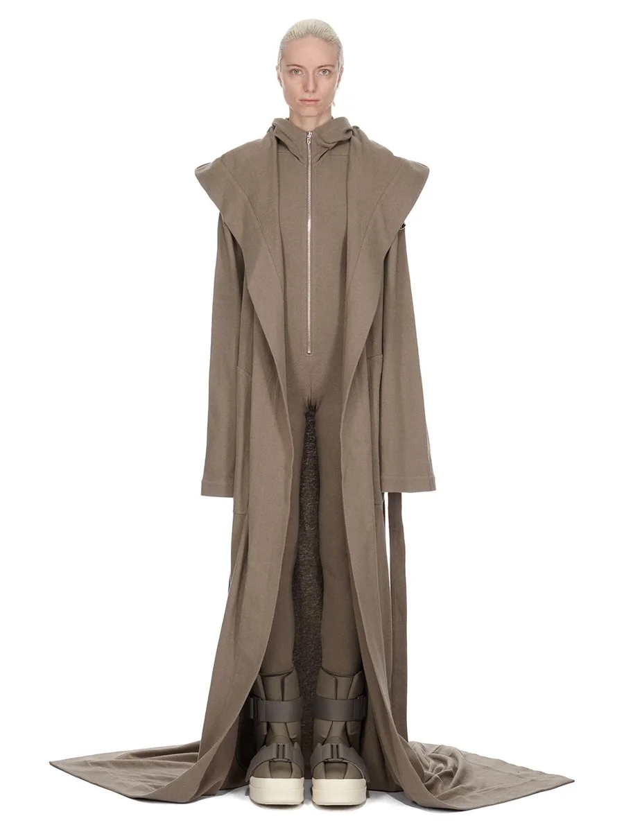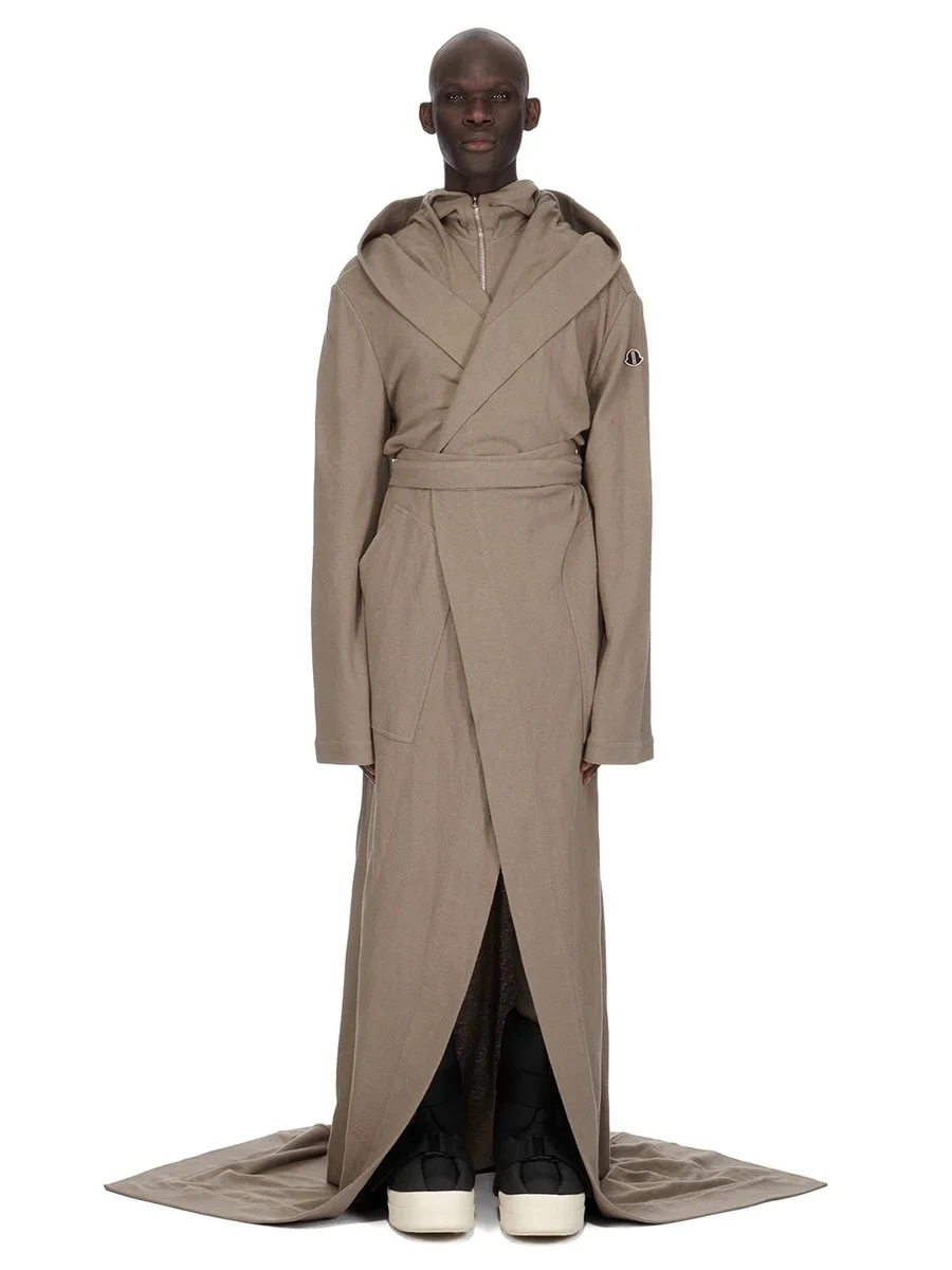 THIS ROBE TRAILS FLOOR LENGTH, AND HAS LONG SLEEVES THAT COVER THE FINGERTIPS. IT HAS A LARGE HOOD AND DOUBLE BREASTED WRAP FRONT WHICH SECURES CLOSED WITH A TIE BELT. IT HAS LEVEL SHOULDER SEAMS. IT HAS THE MONCLER +RICK OWENS EMBROIDERED LOGO PATCH ON THE UPPER LEFT ARM.