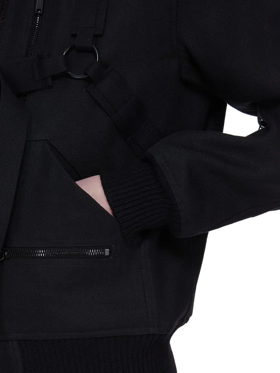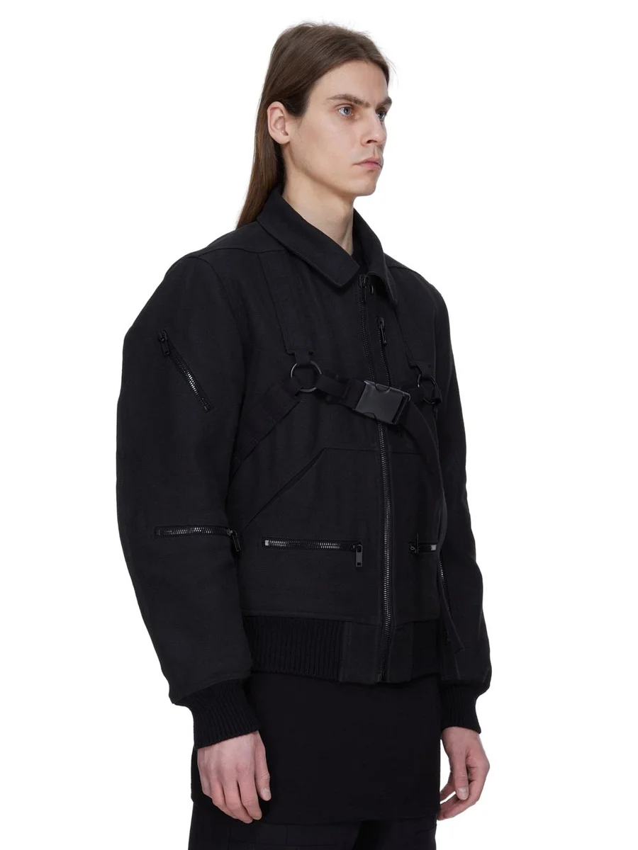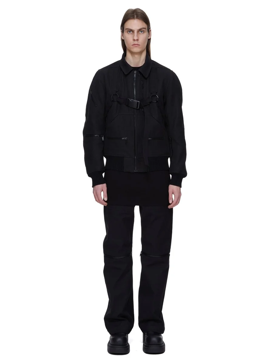 THIS BLIXA BOMBER IS HIP LENGTH WITH LONG SLEEVES WITH ZIPPER DETAILS IN MAT BLACK. IT FEATURES A CENTRE FRONT ZIPPER AND CLASSIC COLLAR THAT CAN BE WORN UP OR DOWN, AND A FRONT HARNESS THAT IS SUPPORTED FROM THE SHOULDER. IT HAS UPDATED RIBBED SLEEVES AND WAISTBAND. IT IS FULLY LINED AND HAS INTERNAL ZIPPERED POCKETS.
