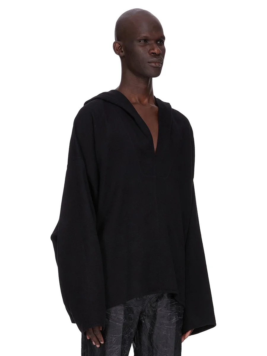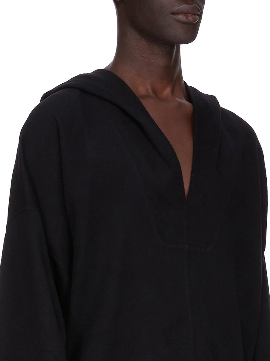 THIS LS KAFTAN HIP IS HIP LENGTH WITH LONG, WIDE SLEEVES. IT HAS A LARGE HOOD WITH A V NECK AND SEAM RUNNING DOWN THE CENTRE FRONT AND BACK. IT IS A VOLUMINOUS KAFTAN SHAPE, WITH A WIDE SHOULDER FALLING INTO A DROPPED ARMHOLE.