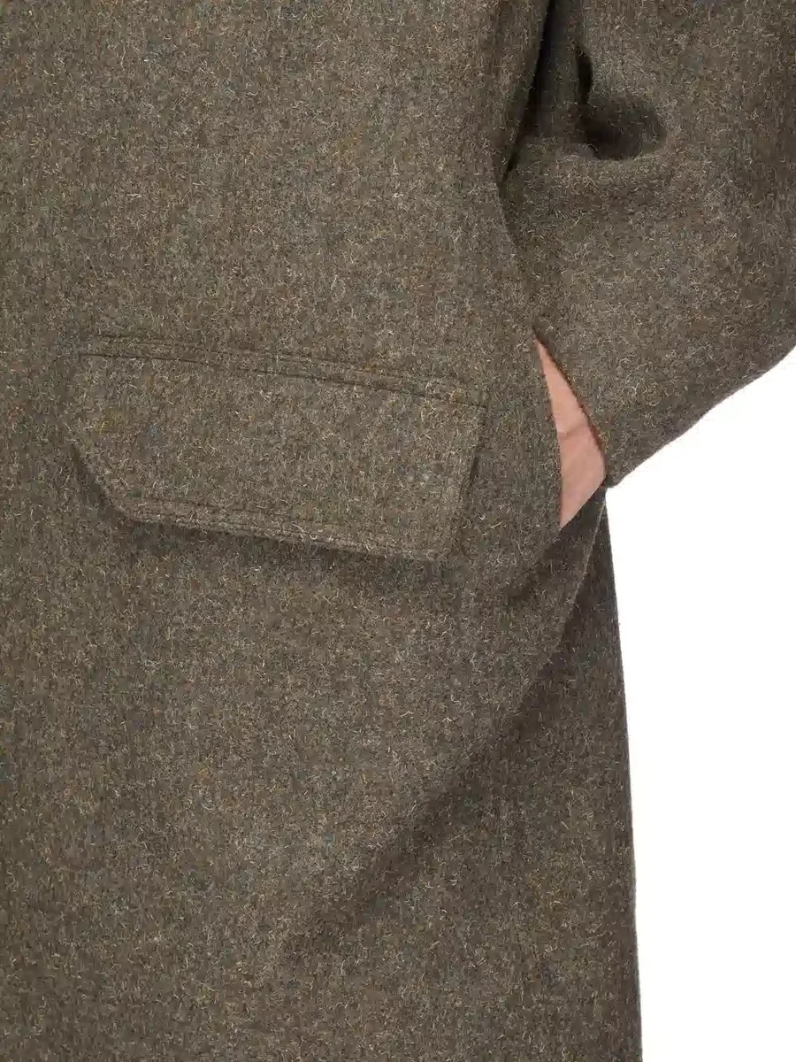 THIS JUMBO MAC IS BELOW KNEE LENGTH WITH LONG SLEEVES AND AN AMPLE FIT. IT HAS A CLASSIC COLLAR AND A CONCEALED CENTRE ZIPPER OPENING, AND TWO LOWER FLAP POCKETS ON FRONT. IT HAS A CENTRE BACK VENT AND IS FULLY LINED WITH TWO INTERNAL ZIPPERED POCKETS.
