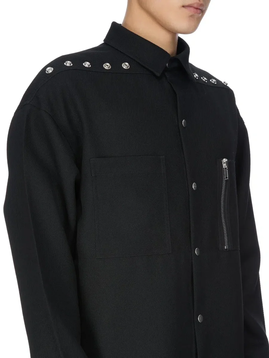 THIS OVERSIZED OUTERSHIRT IS MID-THIGH LENGTH WITH AN OVERSIZED BOXY FIT. IT HAS A CENTRE FRONT OPENING WITH VISIBLE SNAP CLOSURES, A CLASSIC SHIRT COLLAR, BEVELED SIDE SEAMS, SNAP CUFFS AND DOUBLE TOPSTITCHING. IT FEATURES ONE SQUARE CHEST POCKET AND ONE VERTICAL ZIPPERED POCKET ON LEFT. IT HAS THE SIGNATURE LEVEL SHOULDER SEAMS, WITH FIVE SNAP DETAIL, AND A COTTON WEBBING STRAP WITH RIVET DETAIL ON THE BACK YOKE.