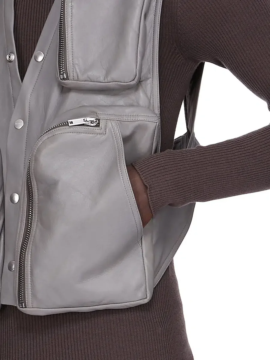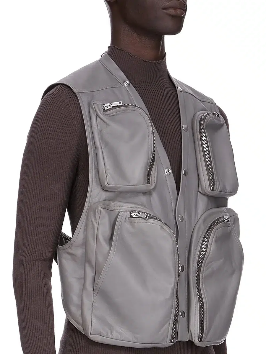 THIS CARGO VEST IS ABOVE HIP LENGTH AND SLEEVELESS. IT HAS A DEEP V NECK WITH THREE FUNCTIONAL VISIBLE SNAP CLOSURES, AND SNAPS CONTINUING AROUND TO THE CENTRE BACK NECK. IT FEATURES ROUNDED BAUHAUS PANNIER POCKETS WITH ZIPS, TWO LARGE ON THE SIDE BODY, AND 2 SMALLER ONES EITHER SIDE OF THE CHEST. IT HAS LEVEL SHOULDER SEAMS AND AN OPEN BACK THAT SECURES WITH A CENTRE SNAP BELT.
