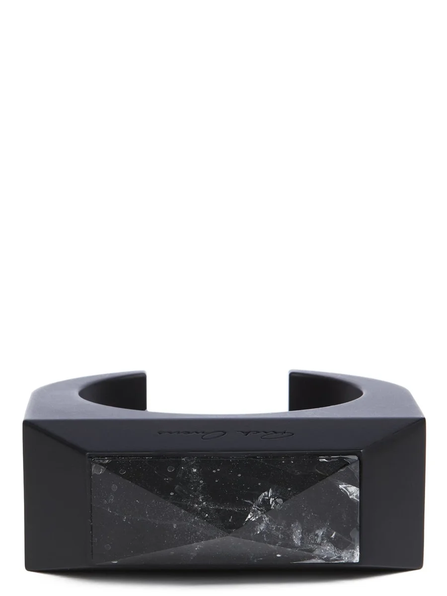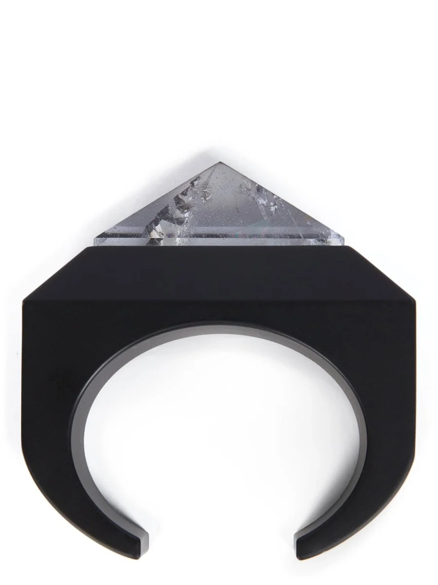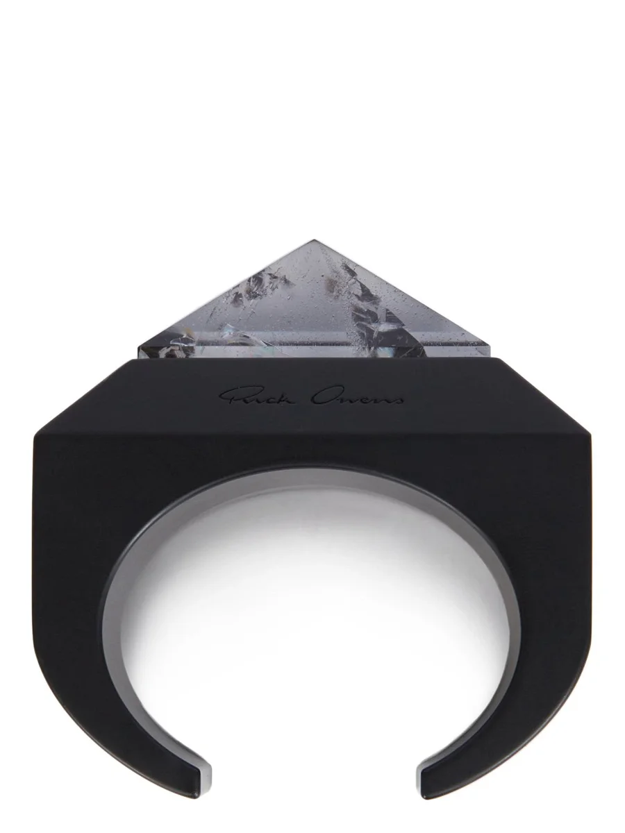THIS CRYSTAL PYRAMID BRACELET IS A LARGE RIGID METAL CUFF WITH BEVELED EDGES. IT IS ORNAMENTED WITH A LARGE PYRAMID SHAPED ROCK CRYSTAL. IT HAS THE RICK OWENS LOGO ENGRAVED IN THE SIDE FACE.