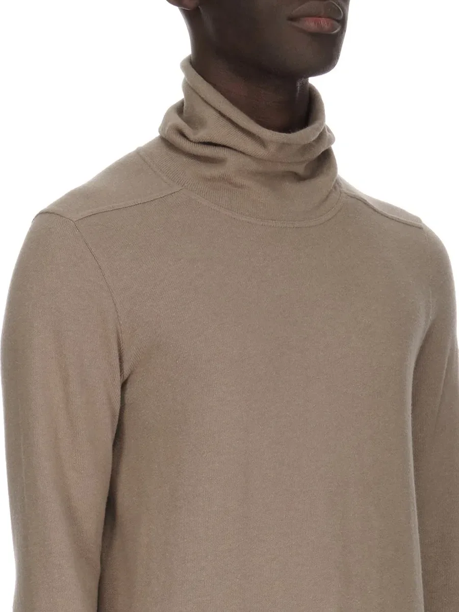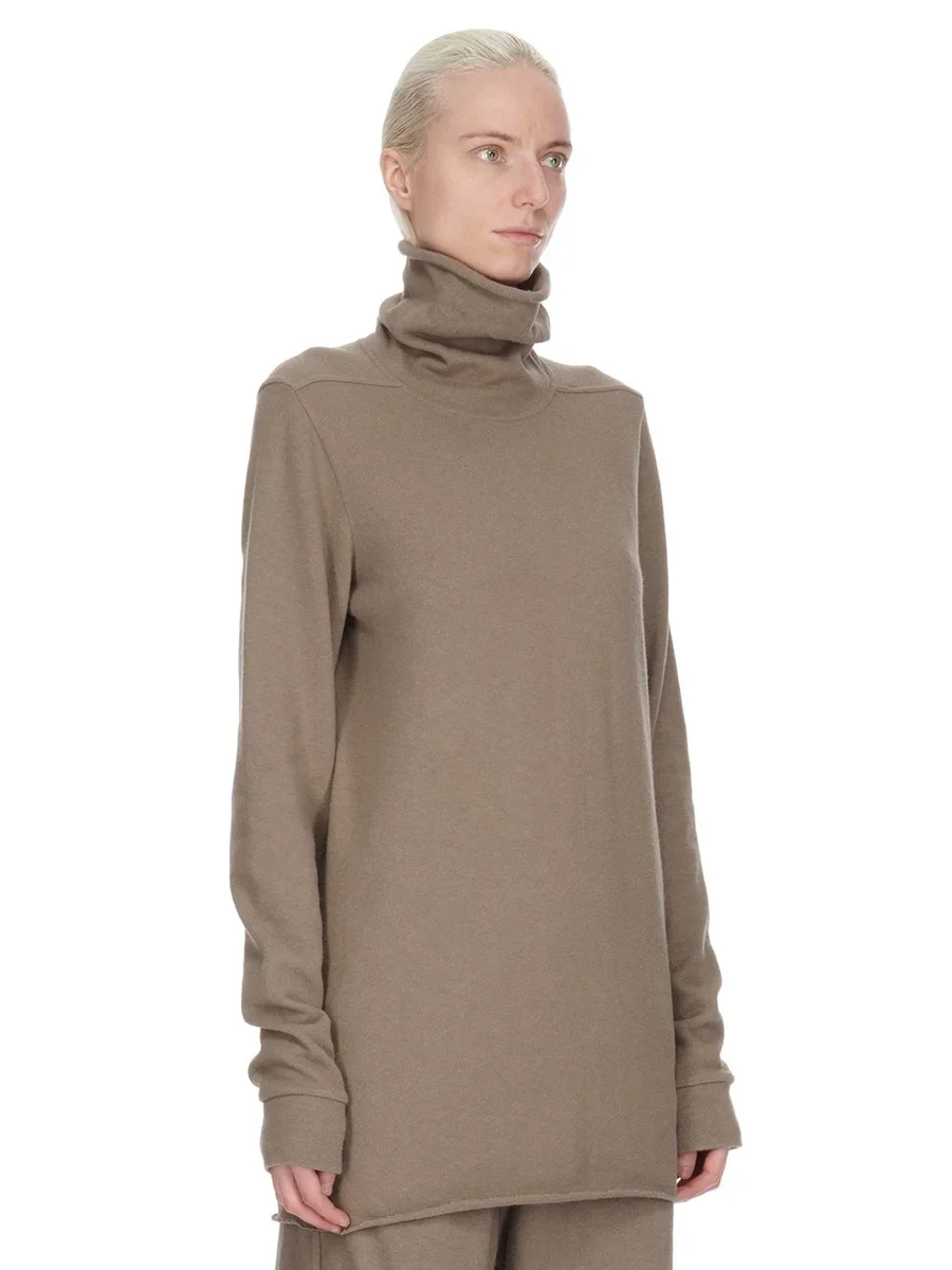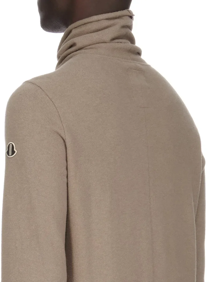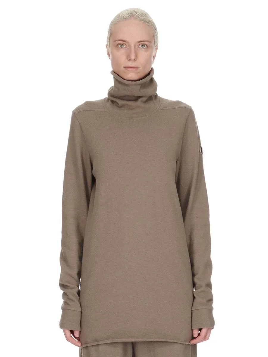 THIS SURF T IS BELOW HIP LENGTH WITH LONG SLEEVES AND A LOOSE FIT. IT HAS A HIGH RIBBED TURTLE NECK AND CUFFS. IT FEATURES THE SIGNATURE LEVEL SHOULDER SEAMS AND SINGLE SEAM RUNNING DOWN THE CENTRE BACK SPINE. IT HAS THE MONCLER +RICK OWENS EMBROIDERED LOGO PATCH ON THE UPPER LEFT ARM.