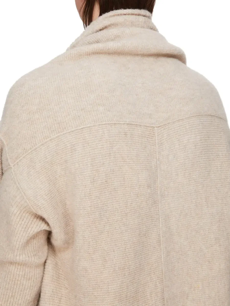 THIS LONG CARDIGAN IS FLOOR LENGTH. IT HAS LONG SLEEVES WITH A DROPPED SHOULDER, IS OPEN FRONTED AND HAS FRONT SIDE PATCH POCKETS. IT FEATURES A RUCHED EFFECT BEHIND THE NECK, ENABLING THIS PART TO BE PULLED UP OVER THE HEAD LIKE A HOOD.